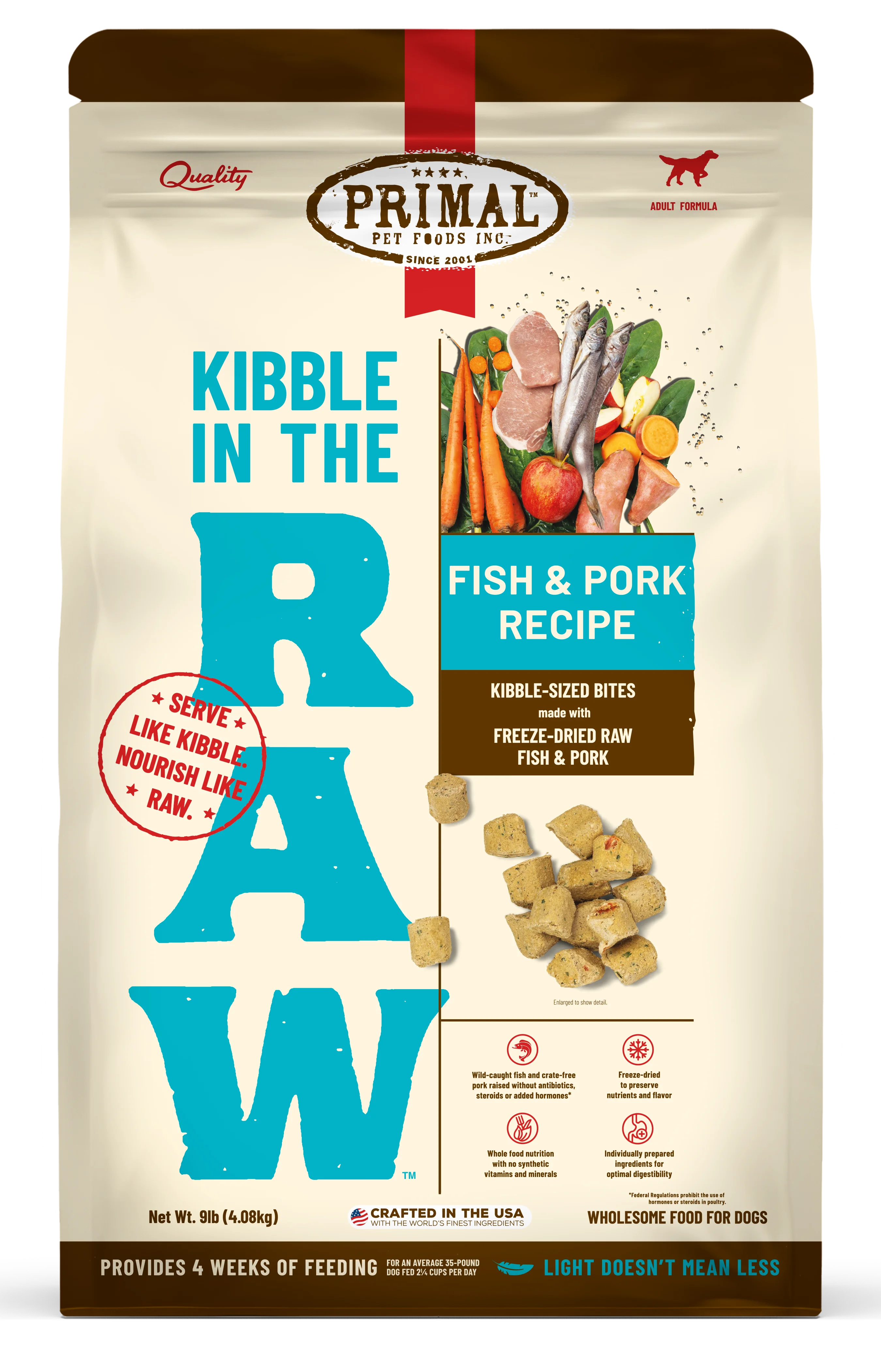 Wild-caught fish and crate-free pork raised without antibiotics, steroids, or added hormones Freeze-dried and minimally processed to preserve vital nutrients Crafted entirely of freeze-dried bites for optimized nutrition with scoop-and-serve convenience Backed by peer-reviewed research to be more digestible and support a healthier gut compared to foods cooked at high heat Lightweight and more nutrient dense than traditional kibble Whole food nutrition with no synthetic vitamins or minerals