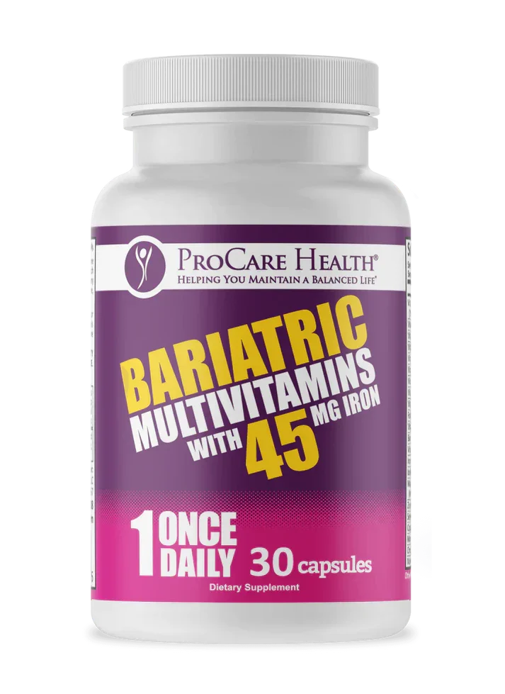 Once Daily Bariatric Multivitamin with 45mg Iron Capsule The Original Once-Daily Bariatric Multivitamin ProCare Health created the first once-daily bariatric multivitamin — designed to simplify post-surgery supplement routines while helping support overall wellness.* Developed in collaboration with bariatric professionals, this capsule provides a complete profile of essential vitamins and minerals in forms the body can utilize effectively. Designed with Bariatric Patients in Mind This once-daily capsule helps make consistent vitamin routines easier for those following bariatric guidelines. It supports daily nutrient intake following procedures such as gastric bypass, sleeve gastrectomy, and other metabolic surgeries — with just one capsule per day.* What Makes This Bariatric Multivitamin Different? Once-Daily Convenience – Combines 22 essential vitamins and minerals into a single capsule to help simplify your daily routine.* Includes 45mg Iron – Provides a form and level commonly recommended after bariatric surgery to help maintain normal iron levels.* High-Potency B Vitamins – Features 20mg Thiamine (B1) and 1,000mcg Methylcobalamin (B12) to help support energy metabolism and nervous system function.* Comprehensive Nutrient Support – Contains Vitamins A, D3, E, and K along with Folate, Zinc, Copper, and Selenium to help support bone health, immune function, and antioxidant activity.* Formulated for Absorption – Utilizes chelated and methylated nutrient forms to support uptake even in low-acid environments.* Balanced Trace Minerals – Provides Zinc and Copper in complementary ratios to help maintain normal cellular and metabolic functions.* ConsumerLab Approved Every ProCare Health once-daily multivitamin is tested and approved by ConsumerLab.com , an independent organization that evaluates dietary supplements for quality, purity, and accuracy of label claims. This third-party verification confirms that: The ingredients listed on the label are present in the stated amounts The product is free from harmful levels of contaminants such as heavy metals The formulation meets strict standards for potency and identity Why ProCare Health? At ProCare Health, we are committed to providing high-quality supplements that you can trust. Here's what makes our Once Daily Bariatric Multivitamin special: Multi-Step Quality Control: Every batch of our supplements goes through rigorous pre and post-testing by independent third-party laboratories. This multi-step quality control process ensures that each product contains exactly what is listed on the label - no exceptions. Expert-Guided Formula: Developed alongside doctors, dietitians, and bariatric coordinators, our products are created to support your nutritional needs with premium ingredients you can trust. Proudly Made in the USA: Our supplements are manufactured in a certified Good Manufacturing Practice facility right here in the USA, ensuring quality and safety every step of the way. *These statements have not been evaluated by the Food and Drug Administration. This product is not intended to diagnose, treat, cure, or prevent any disease. Always consult your healthcare provider before starting any supplement regimen. Packaging and label may vary.