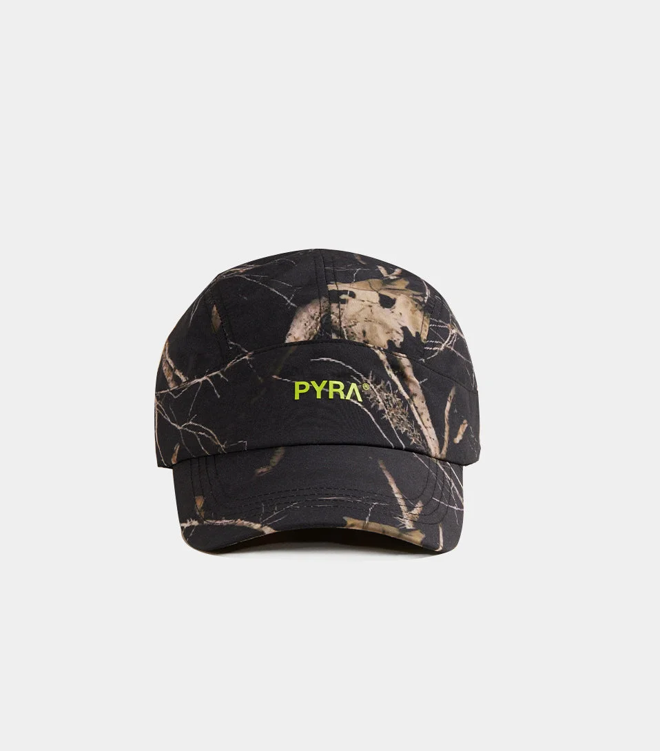 PYRA Hike Club 5 Panel Black/Reflective 5 panel, curved peak hat. Nylon quick-dry body. 3M reflective print with on the front and top. Adjustable strap with plastic closure. Side 3M reflector print. Step up you Hiking game PYRA's Hike Club 5 Panel.