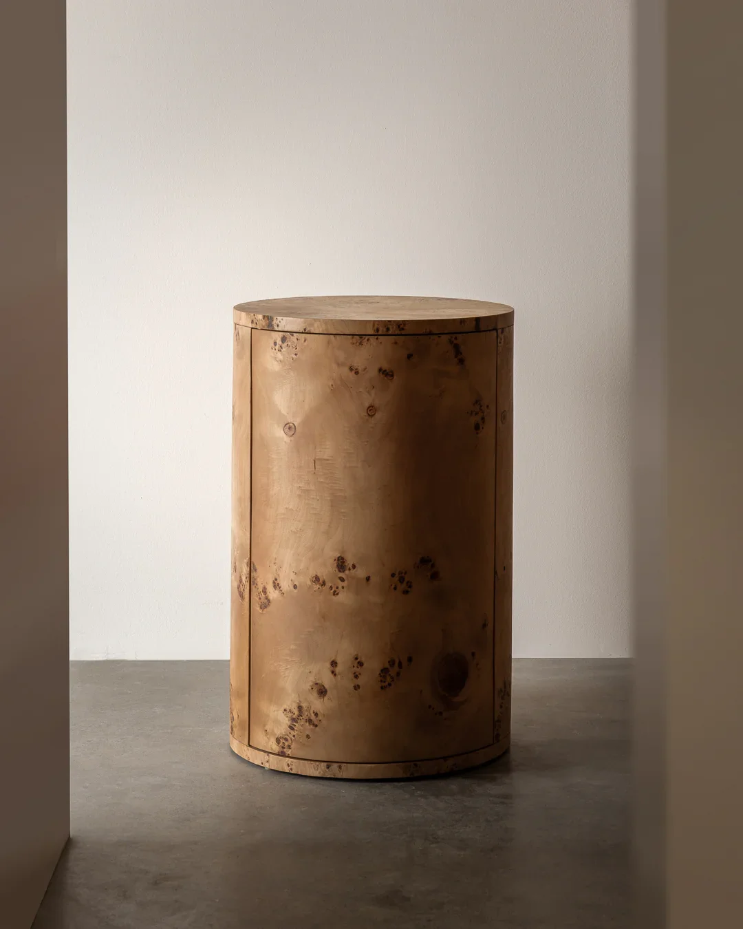 As effortless as it is opulent, the Vernier Round Side Table radiates warmth and curiosity with plenilunio curves revealing hidden, internal shelves. A table as much as a sculpture, its simple form, in balance to its grain and texture, offers a gallery-like mantel on which the curatorial eye may arrange favourite objects, pieces and possessions. Available in Natural & Tabac Burl, as well as Left Hand and Right Hand side Hinge, please make your selection. The Vernier side table is a sister piece to Vernier Linear Side Table and the Vernier Plinth and part of a select family of furniture. The presence of variations can be anticipated as a consequence of the inherent diversity in the material's characteristics. It should be noted that each individual piece possesses its own distinctiveness, contributing to an overall sense of uniqueness.