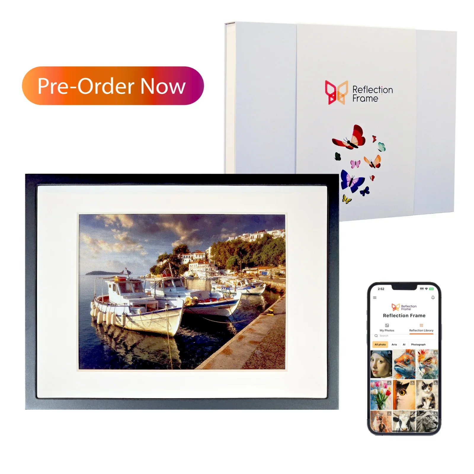 Reflection Frame in Pure White ( Revised Edition ) The Revised Edition has a fixed mat that is not interchangeable without disassembly. Use the Reflection Frame App to effortlessly send photos from your phone to Reflection Frame. With no cords, you can now enjoy your photos anywhere you want! Cord free ePaper display Tap-to-Print technology No subscription or cloud requirements 2 year battery life between charges* *2 year battery life is based on an average of three updates per day Specifications Display: 13.3" E Ink Spectra 6 display 1200x1600 resolution 5000mAh rechargeable battery USB-C charging cable Image size: 8" x 10" Frame size: 12" x 16" x 1" Frame weight : 6 lbs