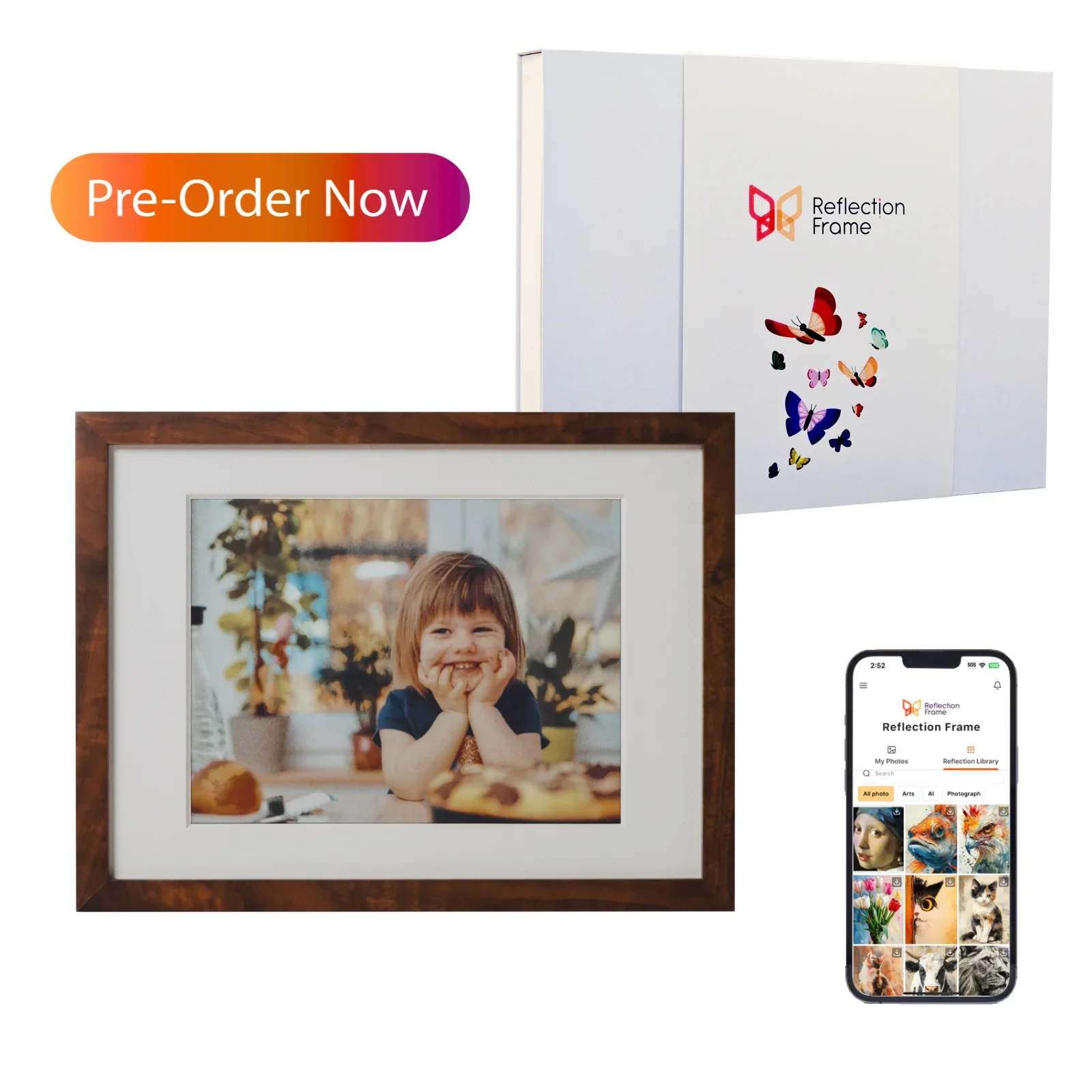 Reflection Frame in Solid Walnut This Special Edition has a fixed mat color that is not interchangeable without disassembly. Surrounded by solid walnut with a deep rich color, this Special Edition Reflection Frame brings ample elegance to your room. Use the Reflection Frame App to effortlessly send photos from your phone to Reflection Frame. With no cords, you can now enjoy your photos anywhere you want! Cord free ePaper display Tap-to-Print technology No subscription or cloud requirements 2 year battery life between charges* *2 year battery life is based on an average of three updates per day Specifications Display: 13.3" E Ink Spectra 6 display 1200x1600 resolution 5,000mAh rechargeable battery USB-C charging cable Image size: 8" x 10" Frame size: 12" x 16" x 1" Frame weight : 6 lbs