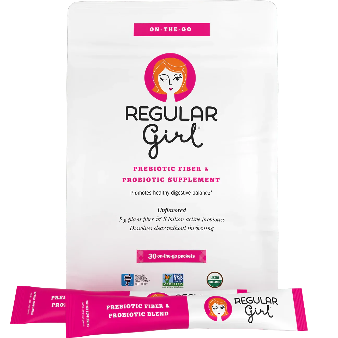 Clinically proven prebiotic soluble fiber (Sunfiber) and probiotics ( bifidobacterium lactis ), created with the help of a woman dietitian. Regular Girl delivers true regularity, addressing both occasional constipation and diarrhea, without excess gas, cramping or bloating.* Low FODMAP Certified, Glyphosate Residue Free Certified, Non GMO Project Verified, Organic Certified, Gluten Free, Vegetarian and Kosher. Contains 30 convenient individual on-the-go packets.