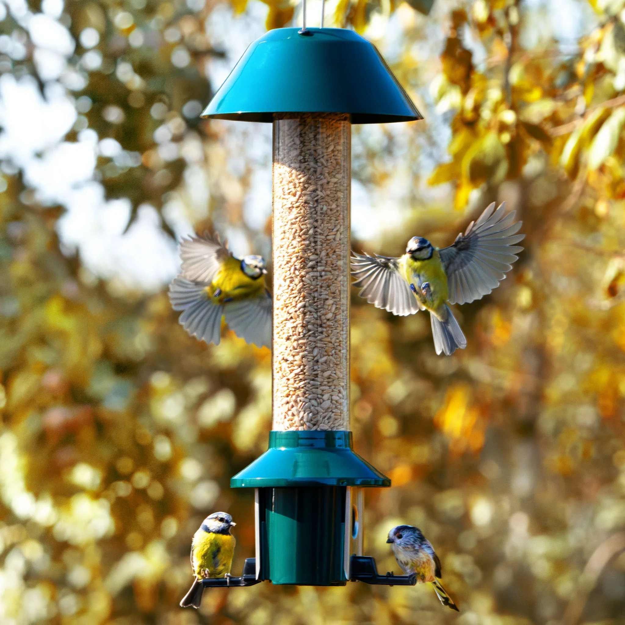 NEW Rats Can't Feed: And nothing spills to attract them in the first place. NEW Corvid Covers Included: For extremely persistent magpies and parakeets that won't take no for an answer. NEW Redesigned Stainless Steel Perches: Comfortable grip for small birds. More visitors, longer stays. Patented PestOff™ Technology: Spring-loaded ports close automatically under squirrels, rats, and corvids. No settings required. Complete Squirrel Protection: Dual all metal baffles and anti-cling ring defeat them from every angle. Riot Shield Grade Tube: Completely chew proof. No squirrel has ever broken through. All Weather Protection: Integrated rain guards keep seed dry in any conditions. 2 Litre Capacity: Fill once, watch for days. No Tools Required : Easy one click setup 8 Colours Available: From Heritage Green to limited edition Coronation Blue. Seed not included.
