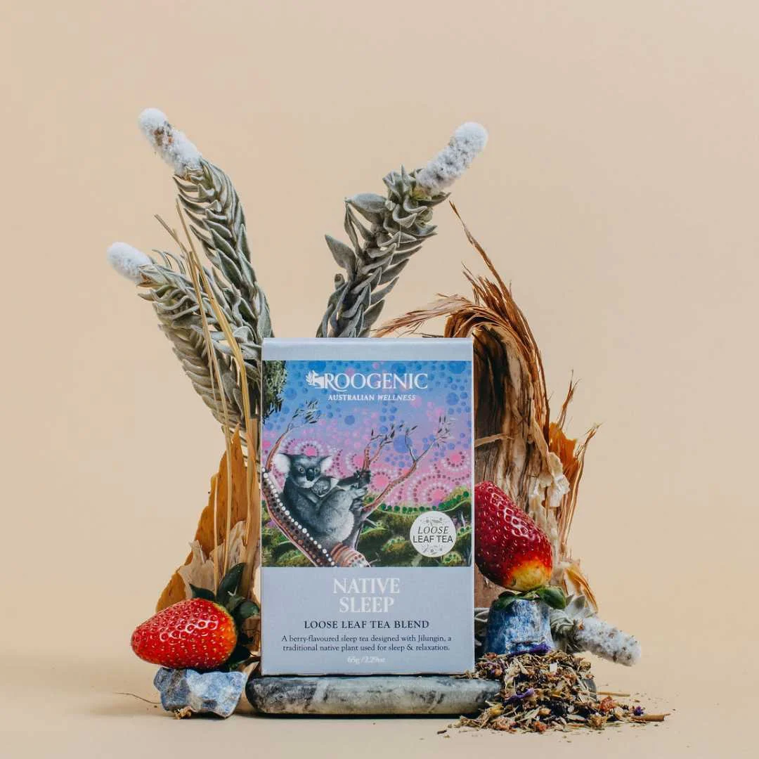 Sleep Tea Description Australia's best sleep tea is made with 5 Australian bush plants traditionally used to ease an overactive mind, relax the body, promote a deep sleep or improve overall wellbeing. It is different from our Native Relaxation Tea due to the inclusion of freeze-dried strawberries to offer a fruity flavour. Bonus: Receive a free 14-day sleep guide with your order. Hear about the powerful healing properties of this blend from our ambassador and farming community leader, Elder Bruno of the Nyul Nyul community: Loose-leaf weight: 65g Teabag weight: 27g (18 Biodegradable Teabags) Key Benefits of Sleep Tea Our Native Sleep Tea can help you unwind, de-stress and achieve deep restorative sleep. The blend is designed with Jilungin, a potent ancient herb used by the Nyul Nyul community for 1000’s of years to quiet the mind and encourage deep sleep. Elder Bruno, the Indigenous grower that sources Jilungin for Roogenic says “the plant put you to sleep... a long deep sleep”. This blend also utilises Aniseed Myrtle, Strawberry Gum Leaf and Lemon Myrtle to support the body’s natural antioxidant activities that are increased during the sleep cycle to help protect against oxidative damage, which is closely associated with premature ageing. The blend is naturopathically accredited and has received 100's+ 5-star reviews. It is also 100% caffeine-free. Sleep Tea Flavour The Sleep Tea has a relaxing fruity flavour from the freeze-dried strawberries with subtle berry notes from the strawberry gum leaf. It is also 100% natural with no artificial flavours. Sleep Tea Ingredients Wild Crafted Jilungin, Organic Lemon Myrtle, Organic Hibiscus, Spearmint, Freeze Dried Strawberry, Blue Mallow Flower, Lemon Balm, Organically Grown Aniseed Myrtle, Organically Grown Native Lemongrass, Organically Grown Strawberry Gum Leaf, Organic Passion Flower, Natural Strawberry Flavour, Natural Raspberry Flavour. Sleep Tea Origin Jilungin is wild-harvested by the Nyul Nyul community in the Dampier Peninsula region of Western Australia. Lemon Myrtle is harvested by small farmers in Northern New South Wales. Aniseed Myrtle is harvested by small farmers in Northern New South Wales. Strawberry Gum Leaf is harvested by small farmers in Northern New South Wales and Denmark Western Australia. Native Lemongrass is wild-harvested by the Nyul Nyul community in the Dampier Peninsula region of Western Australia and South Australia. Sleep Tea Brewing Guide Loose Leaf Tea In a teapot or infuser, add 1 heaped teaspoon to 500ml of boiling water. Steep for 10-15 minutes. Enjoy it before bedtime. Tea Bags Pour 250ml of boiling water over the teabag, then allow it to steep for 6-8 minutes. Enjoy it before bedtime. Iced Tea Steep 3 tsp of loose-leaf tea or 4 tea bags in 1 litre of boiling water for 10 minutes. Place in the fridge to cool or pour over ice. Store for up to 3 days in the fridge.