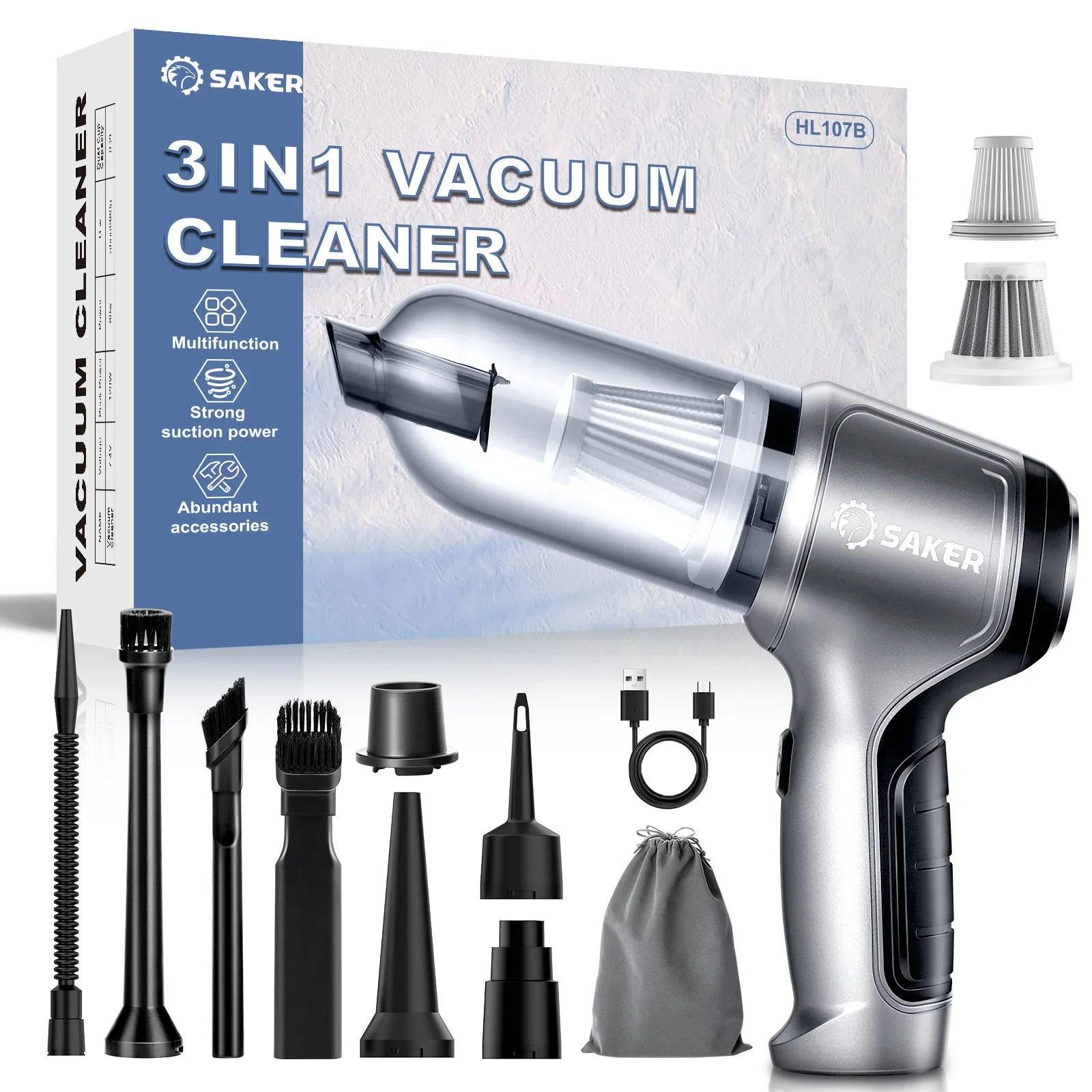 Halten Sie Ihr Auto und Ihr Zuhause makellos! Super Saugkraft wird all den Staub los, den Sie vorher nicht erreichen konnten! Super starker Lüfter, Staub rückstandslos wegblasen! EIGENSCHAFTEN: 3-IN-1-Multifunktionsstaubsauger - Der Handstaubsauger ist mit 3 verschiedenen Düsentypen ausgestattet, um alle Ihre täglichen Reinigungsanforderungen zu erfüllen. Es kann nicht nur als Staubsauger für die tägliche Reinigung von Haus-, Fahrzeug- und Tierhaaren verwendet werden, sondern auch als Luftpumpe zum Aufblasen von Rettungsringen oder Schwimmwesten und als Vakuumpumpe zum Aufbewahren von Taschen und anderen Zwecken. Bürstenloser Motor und hochwertige HEPA-Filter - 3-in-1 Staubsauger nimmt bürstenlosen Motor an, der reibungslos laufen kann, die Lebensdauer der Maschine verlängert und Ihnen eine bessere Nutzungserfahrung gibt. Darüber hinaus ist unser Staubsauger mit zwei HEPA-Filterelementen ausgestattet, von denen eines ein feines Stahlfilterelement ist. Das Material ist von hoher Qualität, nicht leicht zu beschädigen, und kann wiederholt verwendet werden. Kabelloses Design und Tragbarkeit - Der kabellose Staubsauger ist klein und leicht, wodurch er einfach zu verstauen ist und überall hin mitgenommen werden kann, und die starke Saugkraft sorgt auch für eine schnelle Abfallbeseitigung, was ihn zur perfekten Wahl für den Einsatz zu Hause und im Freien macht. Hohe Saugkraft von 12000PA - Der 3-in-1-Staubsauger bietet die schnellste und gründlichste Reinigung, entfernt mühelos Tierhaare, Staub, Schmutz und mehr und reinigt jeden Winkel und jede Ritze. Mehrere Nutzungsszenarien - Der 3-in-1-Staubsauger hat drei verschiedene Verwendungszwecke und kann in einer Vielzahl von Szenarien verwendet werden. Sie können es verwenden, um die Snackkrümel zu entfernen, die versehentlich durch das Essen im Auto gefallen sind. Sie können die Teppichhaare Ihres Haustieres auch zu Hause reinigen. Auch im Auto kann er jederzeit bei Outdoor-Aktivitäten eingesetzt werden, um Ihnen die passenden Hilfsmittel, wie den Schwimmring und den Ballon, zur Verfügung zu stellen. Und wenn Sie Ihre Kleidung ausziehen, kann es als Kompressionsbeutelpumpe verwendet werden. Es gibt viele Szenarien, die Sie verwenden können, und eins zu haben ist gleich viele! STAUBSAUGERSET: Lange Blasdüse + Bürste Langes und flaches Saugmaul + Bürste Kurze Blasdüse Bodenbürste Fliter Multifunktions-Luftgebläse Feines Stahlfilterelement Aufbewahrungstasche USB-Ladekabel(Typ-C) STAUBSAUGERFILTER SET: 1 * Edelstahlfilter 1 * HEPA-Filter Produktinformation Attribut Spezifikation Material ABS Gewicht ca. 380 g Leistung 80 W Nennspannung 7,4 V Nenndrehzahl 75.000 U/min Ladezeit 4 Stunden Laufzeit 17~30 Minuten Lärm ≤70 dB Maximales Volumen 0,2 L Betriebstemperatur -20℃~+50℃ USB-Kabellänge ca. 1 m (Typ-C) Filter Edelstahlfilter & HEPA-Filter Batteriekern 2*2500 mAh HINWEIS: Bitte erlauben Sie leichte Messabweichungen aufgrund der manuellen Messung. Aufgrund des unterschiedlichen Monitors und Lichteffekts kann die tatsächliche Farbe des Artikels geringfügig von der auf den Bildern gezeigten Farbe abweichen.