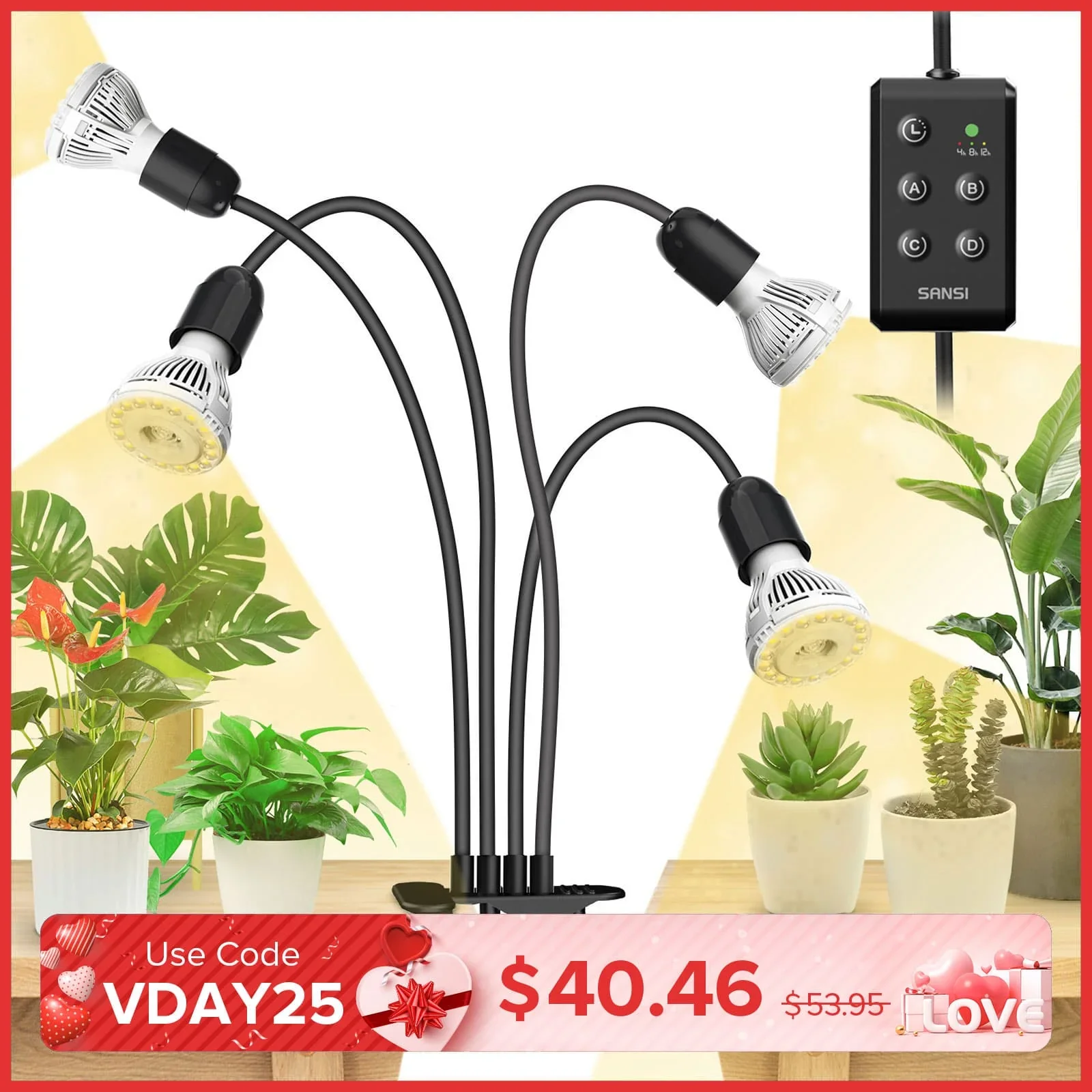 About this item FULL SPECTRUM HIGH EFFICIENCY GROW LIGHTS: SANSI grow light emits all wavelengths from 380nm to 800nm - just like natural sunlight. With white light efficient LED diodes and higher PAR output, grow lights greatly promote indoor growth by accelerating photosynthesis, which is 18 times higher than other brand, ideal for all growth stages and a variety of plants such as herbs, succulents, orchids, cherry tomatoes, monstera, etc. LIFETIME REPLACEABLE BULBS & QUALITY GUARANTEES: Grow bulbs can be replaced, which facilitates customers to replace broken bulbs and avoids to repurchasing the whole grow light. Additionally, SANSI offers a whole-life free warranty for the bulb. ETL listed, and quality and safety verified. (Attention Please: The max safety wattage rating is 10W for each head). We have a professional service team that provides 7x24 online help. Please contact our team on Amazon Message if you met any Problems. AUTO ON/OFF TIMER: SANSI growing light offers an Auto on/off timer function with 3 options that are 4Hrs, 8Hrs and 12Hrs. It's based on a 24-hour cycle from when you set the timer. For example, when keeping power ON, if you select 8 Hrs, it will turn ON for 8 hours per 24 hours. ENERGY SAVING: This grow lights for indoor plants provide a bright light output of 4000LM. Save 90% on your electricity bill by using a high-lumen LED chip equivalent to a 600-watt traditional light bulb while consuming only 40 watts. PROFESSIONAL HIGH-EFFICIENCY SOLUTIONS FOR INDOOR PLANT GROWTH: SANSI offers a number of core patented technologies that provide more efficient and stable lighting, effectively help your beloved plants thrive, and support a variety of usage scenarios (desktop, plant stand, desk, and hanging), which can be flexible placement anywhere in your home or office. Technical Details Material Ceramic, Polycarbonate Light Source Type LED Power Source Corded Electric Brand SANSI Voltage 120V for US/CA 220V for EU/UK Brightness 4000 Lumen Color Temperature 4000 Kelvin Specification Met ETL Product Dimensions 8.46"L x 7.56"W x 5.51"H Manufacturer Pujiang Yuansheng Electronic Commerce Co., Ltd. Part Number C21GL-GE26-10W Item Weight 3.09 pounds Country of Origin China Item model number C21GL-GE26-10W Item Package Quantity 1 Included Components 10W Grow Light x4 Wattage 40 watts