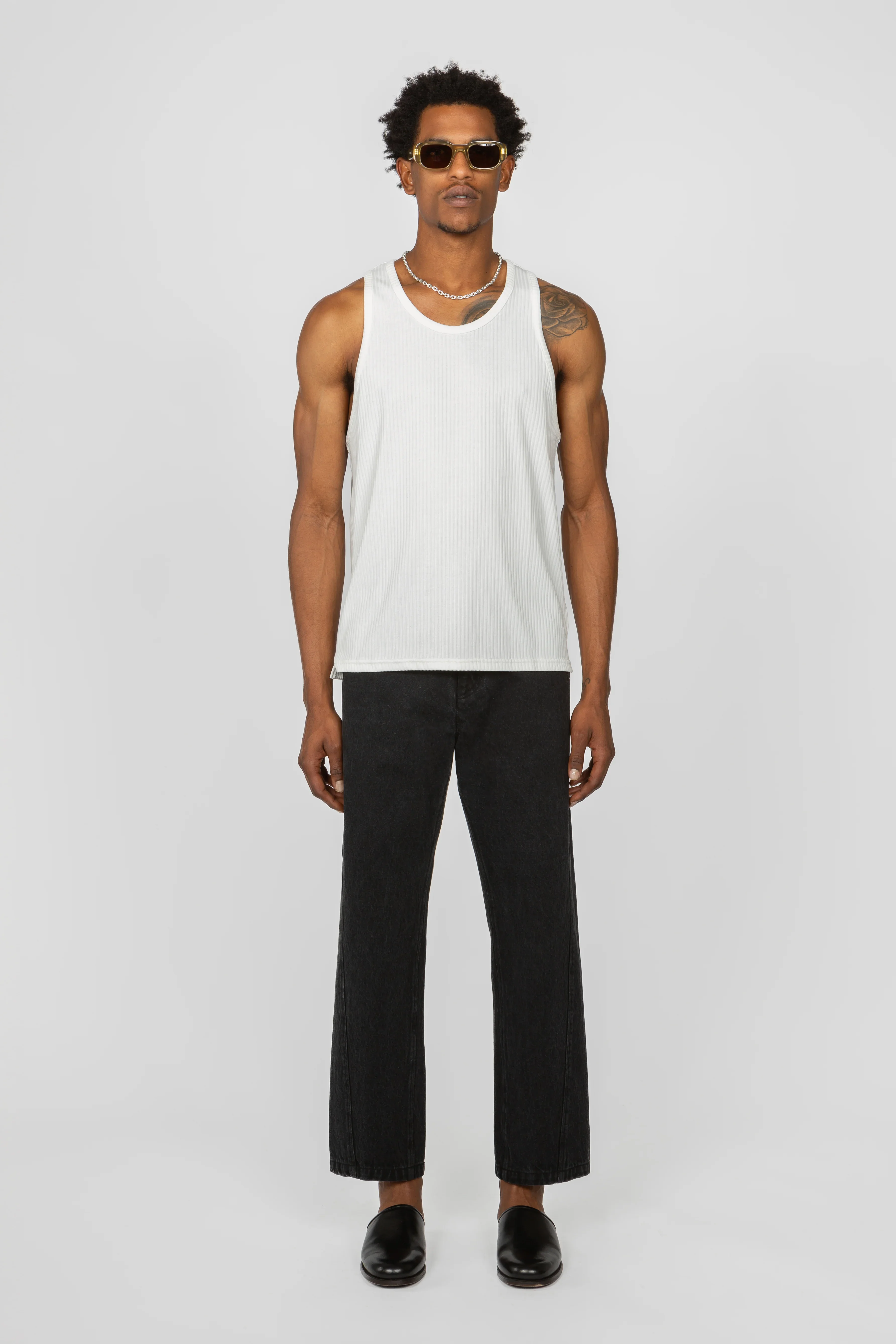 • Relaxed, slim fit • Rib knit fabric, with rib neckline and armholes • Straight hem • Pictured with our Twisted Seam Pant in Bleached Denim Fabric 72% Polyester 20% Rayon 8% Spandex Model Measurements Model is in size M Model is 6'2" / chest 38 / waist 32 Product Measurements We have provided this item's measurements to help you decide which size to buy. All measurements are in inches. Free Shipping & Easy Returns