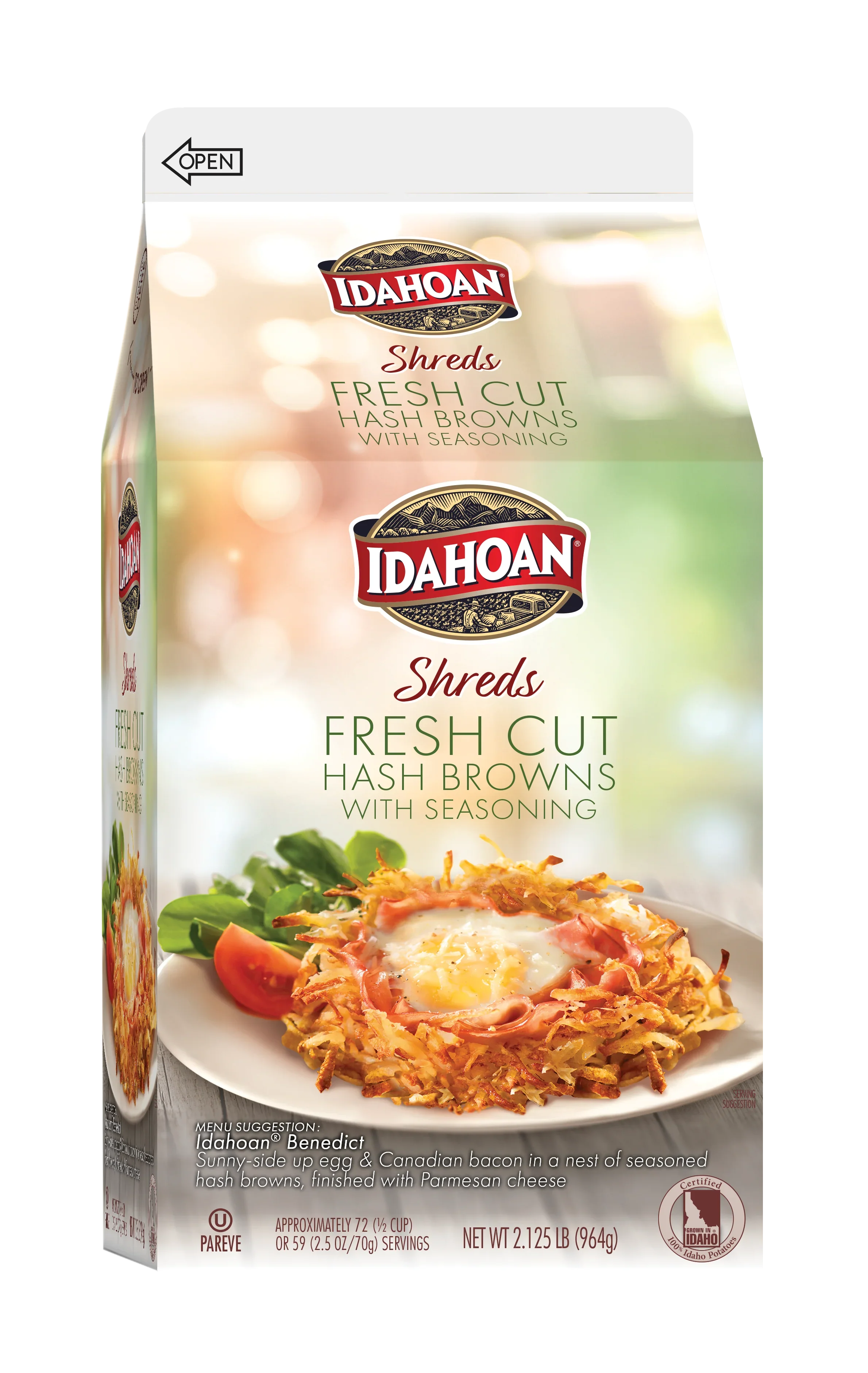 Always made from Certified 100% Idaho® Potatoes, Idahoan® SHREDS Fresh Cut Hash Browns with Seasoning are cut, peeled, trimmed, and prepared using our proprietary cooking method. These Fresh-Dried™ potatoes offer fast and consistent prep, and provide precious time and labor savings while delivering the delicious scratch-like flavor that keeps guests coming back for more. Serve as a traditional side or get creative with trendy bowls, mix-ins, and patties! A classic hash brown, made easy—you can be confident in serving craveably crispy, perfectly seasoned potatoes every time. Made with certified 100% Idaho® potatoes Fresh-Dried™ cooking method to preserve the integrity of the potato 2.125 lb Carton (Pack of 6) Quick and easy prep, saving operators time and money Naturally Gluten-Free