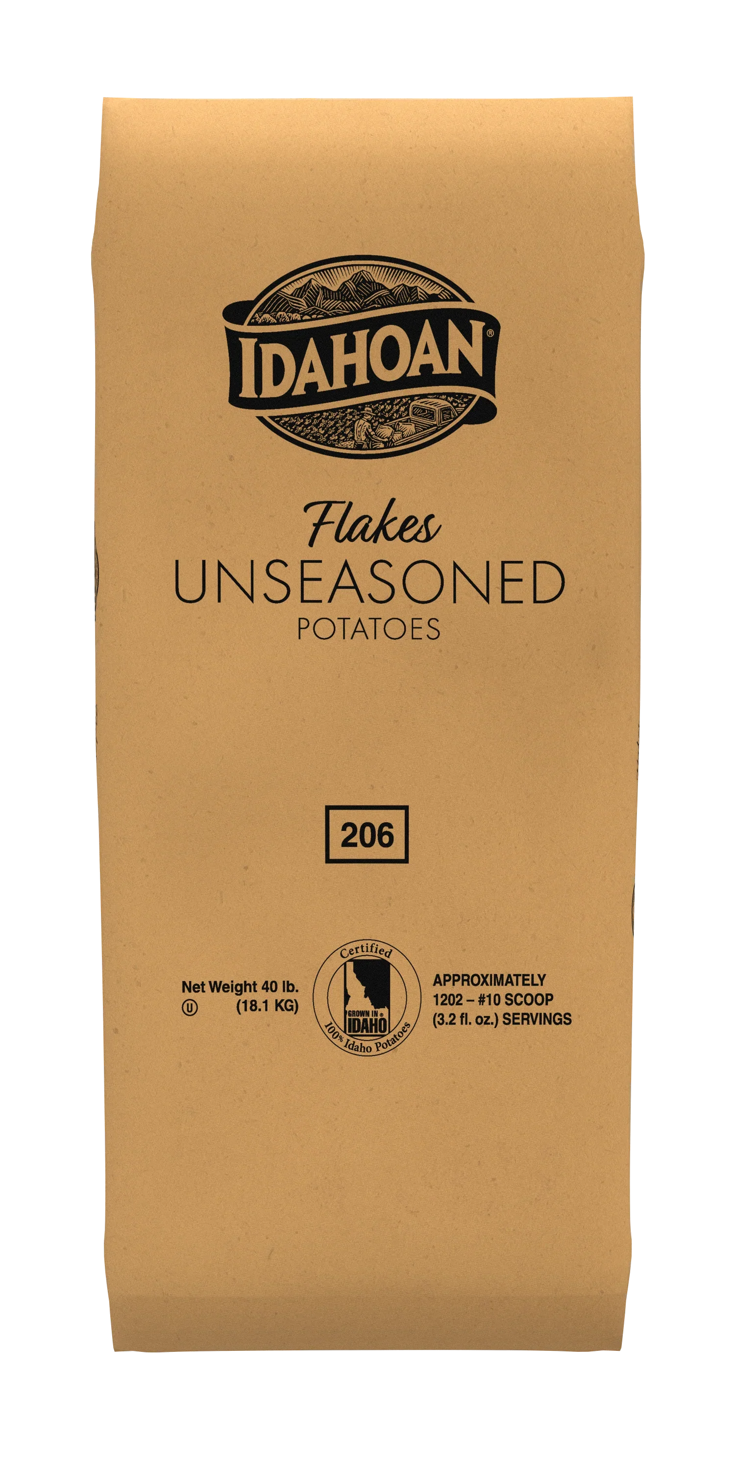 Idahoan® FLAKES Unseasoned Potatoes offer quick and easy preparation with delicious flavor. They can be served as is or used as an ingredient in your favorite dishes. The perfect canvas for your culinary creativity, Idahoan FLAKES allow you to serve up the famous flavor of Certified 100% Idaho® Potatoes in a convenient Fresh-Dried™ format. Made with certified 100% Idaho® potatoes Fresh-Dried™ cooking method to preserve the integrity of the potato 40 lb Bag (840 Servings) Quick and easy prep, saving operators time and money Naturally Gluten-Free