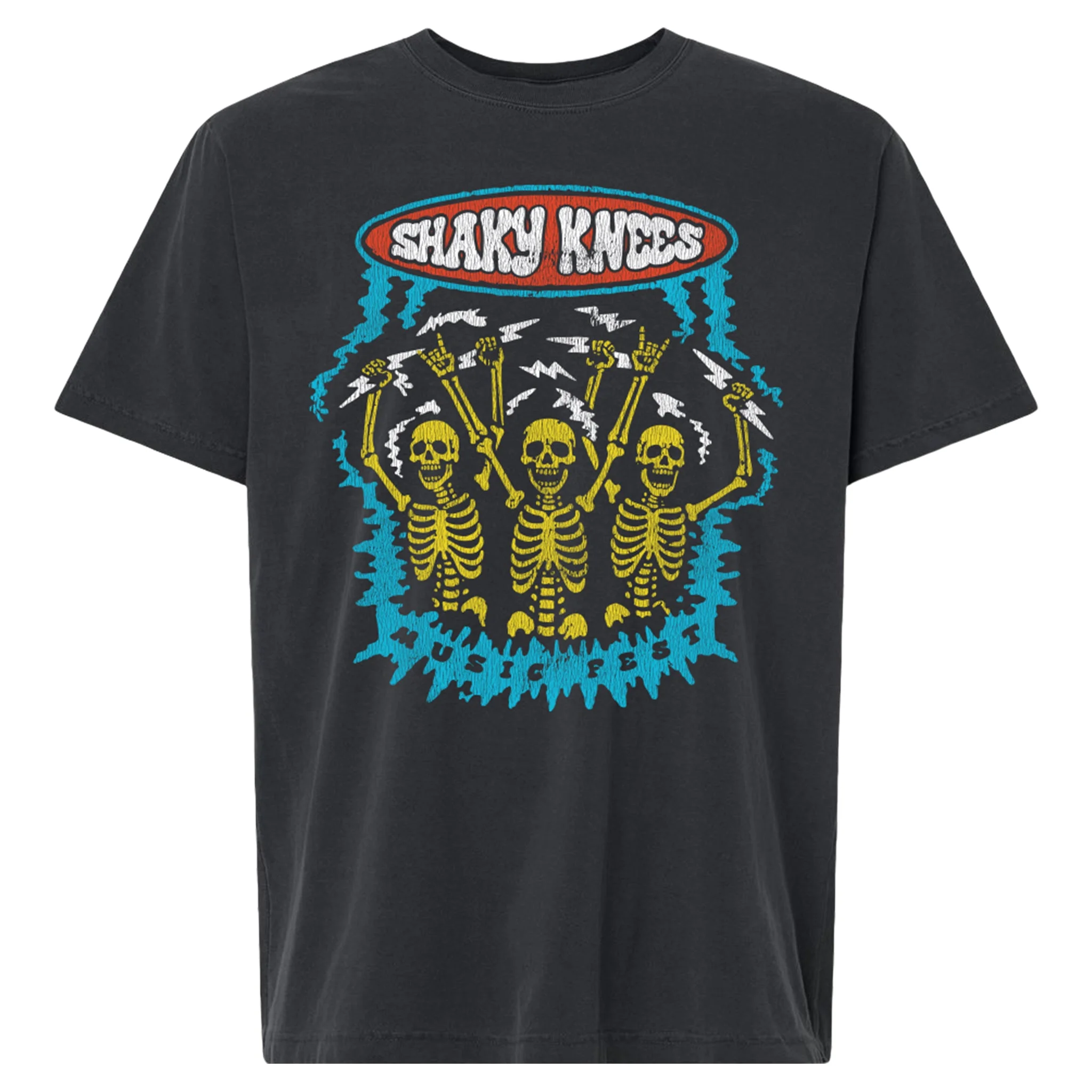 Bring Shaky Knees home with this electrified skeleton tee. Whether you're a festival regular or just love the Atlanta music scene, this piece lets you celebrate Shaky Knees style all year long. PRODUCT DETAILS: 100% cotton Relaxed fit Color: Black SIZE S M L XL 2XL 3XL CHEST 19.75" 20.75" 22.75" 24.75" 26.75" 28.75" LENGTH 27.75" 28.75" 29.75" 30.75" 31.75" 32.75"