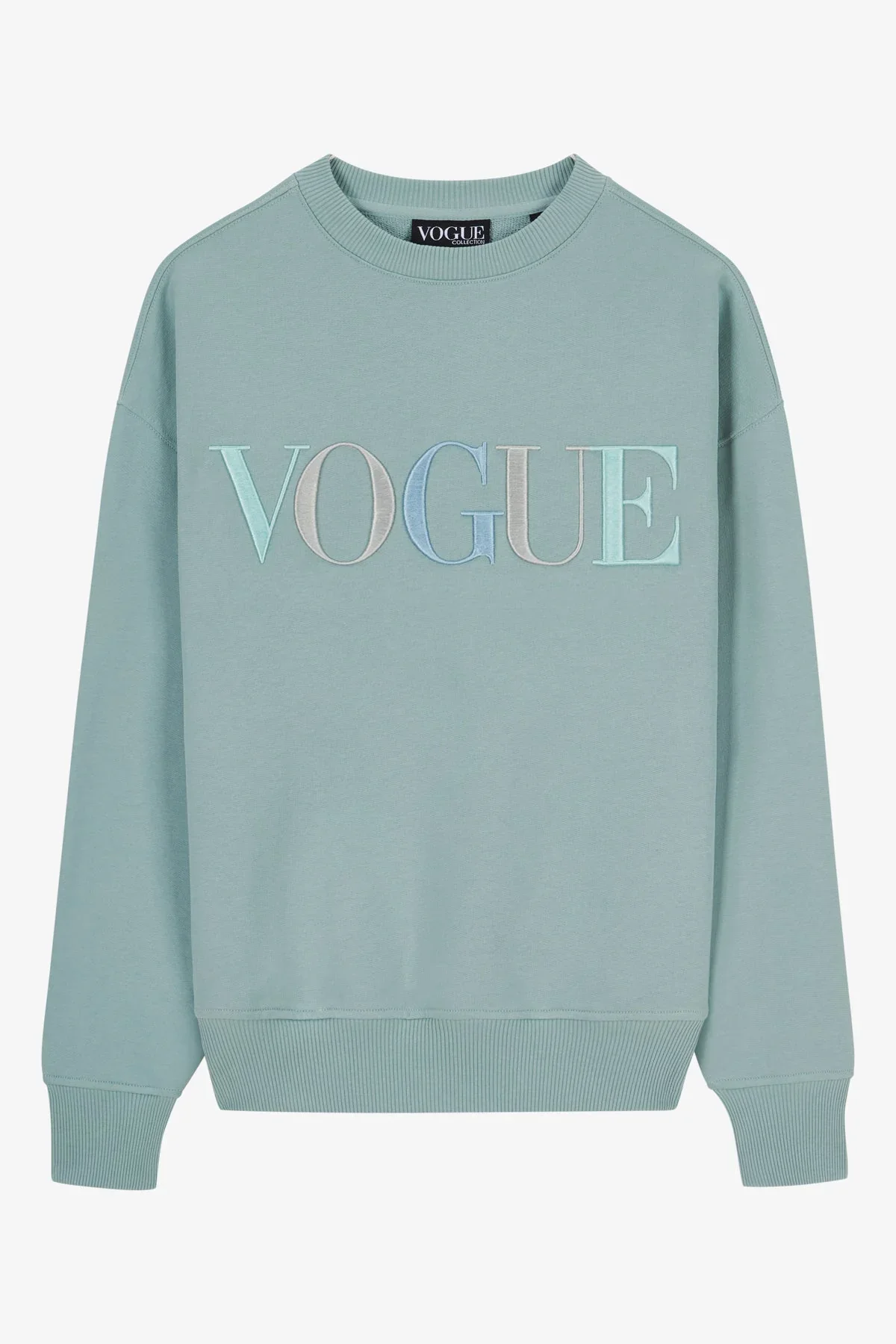 VOGUE Sweatshirt in ice blue with colorful logo embroidery, made from 100% organic cotton. The VOGUE Sweatshirt, made from high-quality cotton with overcut shoulders, is ethically produced in Portugal. - Loose fit - High-quality 3D logo embroidery in varying pastel shades - Ribbed cuffs - GOTS certified For an oversized fit, we recommend choosing one size larger. Discover the VOGUE Sweatshirt in other colors.