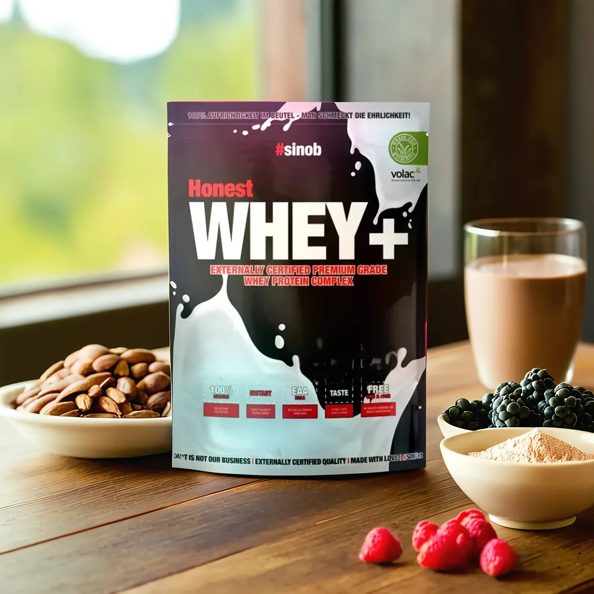 Honest Whey - Pure Ehrlichkeit, Löffel für Löffel Eine optimale Proteinzufuhr ist unerlässlich - nicht nur für Bodybuilder und die, die es noch werden wollen, sondern auch für Ausdauersportler , Bauarbeiter, Bankangestellte, Bäcker, Hausfrauen, Kraftfahrer, Manager, Neurologen, Teilzeitjobber und sogar Quallenzüchter. Ein Hühnchensteak mag zwar auch reichlich Protein liefern, aber unser Honest Whey bietet dank seiner Herkunft von einem renommierten Markenhersteller namens VOLAC aus Irland entscheidende Vorteile : Einfacher Transport und ideal als Snack für unterwegs. Dank des hohen Anteils an der essentiellen Aminosäure Leucin wird die Muskelproteinsynthese stärker angeregt. Das Protein ist aufgrund seiner hohen Verdaulichkeit schneller verfügbar . Wer möchte schon vor oder während des Trainings Hühnchen essen? Mit Honest Whey kein Thema. Honest Whey ist nicht nur eine Ergänzung, sondern dank der Milch von Kühen, die mindestens 300 Tage im Jahr weiden und 90% ihrer Nahrung durch Grasfütterung erhalten, eine unschlagbare Wahl . Transparenz und Qualität stehen bei uns an erster Stelle. Jede Charge unseres Whey wird extern auf Schadstoffe und den korrekten Proteingehalt geprüft und die Ergebnisse werden zur vollen Einsicht veröffentlicht . Detaillierte Berichte und Analysen zu jeder Sorte sind zum Herunterladen verfügbar, und jedes Aminogramm findet sich auf jedem Beutel - für maximale Transparenz. Hergestellt wird unser Whey 100% in Deutschland - es wird nicht nur abgepackt und umgefüllt. Wir nutzen ausschließlich natürliche und naturidentische Aromen in Spitzenqualität für ein außergewöhnliches Geschmackserlebnis. Unsere absolute Top-Löslichkeit verhindert jegliche Klumpenbildung. Dank der extrem hohen Rohstoffqualität ist unser Whey besonders bekömmlich. Die Beutel sind durch gelaserte Risskanten leicht zu öffnen und dank eines patentierten Protein-Klettverschlusses aus der Raumfahrttechnik einfach wieder zu verschließen . Adieu, Stress beim Öffnen! Mit über 25 Sorten bieten wir eine beeindruckende Geschmacksvielfalt - Honest Whey, das Synonym für Ehrlichkeit, Qualität und Geschmack . Entdecke, wie lecker Protein sein kann und stärke deinen Körper mit jedem Löffel Honest Whey. #faq Wie wird das SINOB Honest Whey hergestellt? Unser Honest Whey besteht aus hochwertigem Molkenprotein-Konzentrat von Volac – einer der besten Quellen Europas. Die Kühe grasen rund 300 Tage im Jahr auf irischen Weiden. Das sorgt für Qualität, die man schmeckt. Was macht Honest Whey so besonders? Ganz einfach: Nur eine einzige, transparente Quelle statt einem wilden Mix aus 10+ Rohstoffen unbekannter Herkunft. Wir setzen auf Ehrlichkeit, Qualität und Geschmack – ohne Schnickschnack. Ist Honest Whey auch was für Anfänger? Klar! Egal ob du gerade erst loslegst oder schon lange dabei bist – Honest Whey liefert dir hochwertiges Protein, das deinen Körper bei Muskelaufbau und Regeneration unterstützt. Wie nehme ich Honest Whey am besten ein? Am besten direkt nach dem Training – da freut sich dein Körper besonders über die schnelle Eiweiß-Versorgung. Oder einfach zwischendurch, wenn du deine Proteinzufuhr easy boosten willst. Wie wird Honest Whey zubereitet? Ganz einfach: 2 leicht gehäufte Esslöffel (ca. 30 g) in 200–300 ml kaltes Wasser oder Milch geben, kräftig schütteln – fertig! Je nach Geschmack kannst du natürlich etwas mehr oder weniger Flüssigkeit verwenden. Wo ist der Messlöffel? Den gibt’s bei uns nicht mehr – bewusst. Statt zusätzlichem Plastik genügt ein ganz normaler Esslöffel aus der Küche. 2 Esslöffel = 1 Portion (ca. 30 g). Wie schmeckt Honest Whey? Kurz gesagt: richtig gut! Die Sorten sind cremig, vollmundig und nicht künstlich überladen. Viele feiern’s sogar nur mit Wasser – mehr müssen wir nicht sagen, oder? Womit wird gesüßt? Wir verwenden eine ausgewogene Mischung aus Sucralose und Acesulfam K. Kein Zucker, kein Stevia, kein bitterer Nachgeschmack – nur runder, klarer Geschmack. Ist Honest Whey glutenfrei? Ja, bis auf die Sorte Honest Whey Haselnuss, ist unser Honest Whey glutenfrei und auch für Menschen mit Glutenunverträglichkeit geeignet. Kann ich Honest Whey auch zum Backen verwenden? Auf jeden Fall! Egal ob Pancakes, Porridge oder Proteinriegel – Honest Whey macht deine Snacks nicht nur leckerer, sondern auch eiweißreicher. Wo wird Honest Whey abgefüllt? In Deutschland – unter strengen Qualitätsstandards. So bleibt alles sauber, sicher und ehrlich – wie der Name schon sagt.