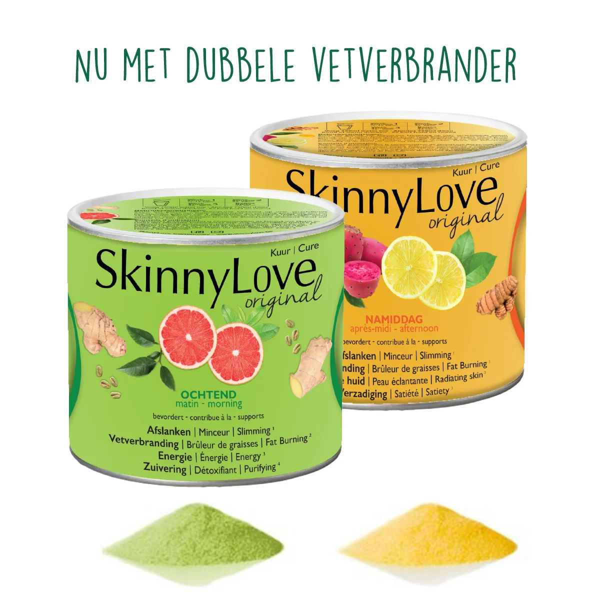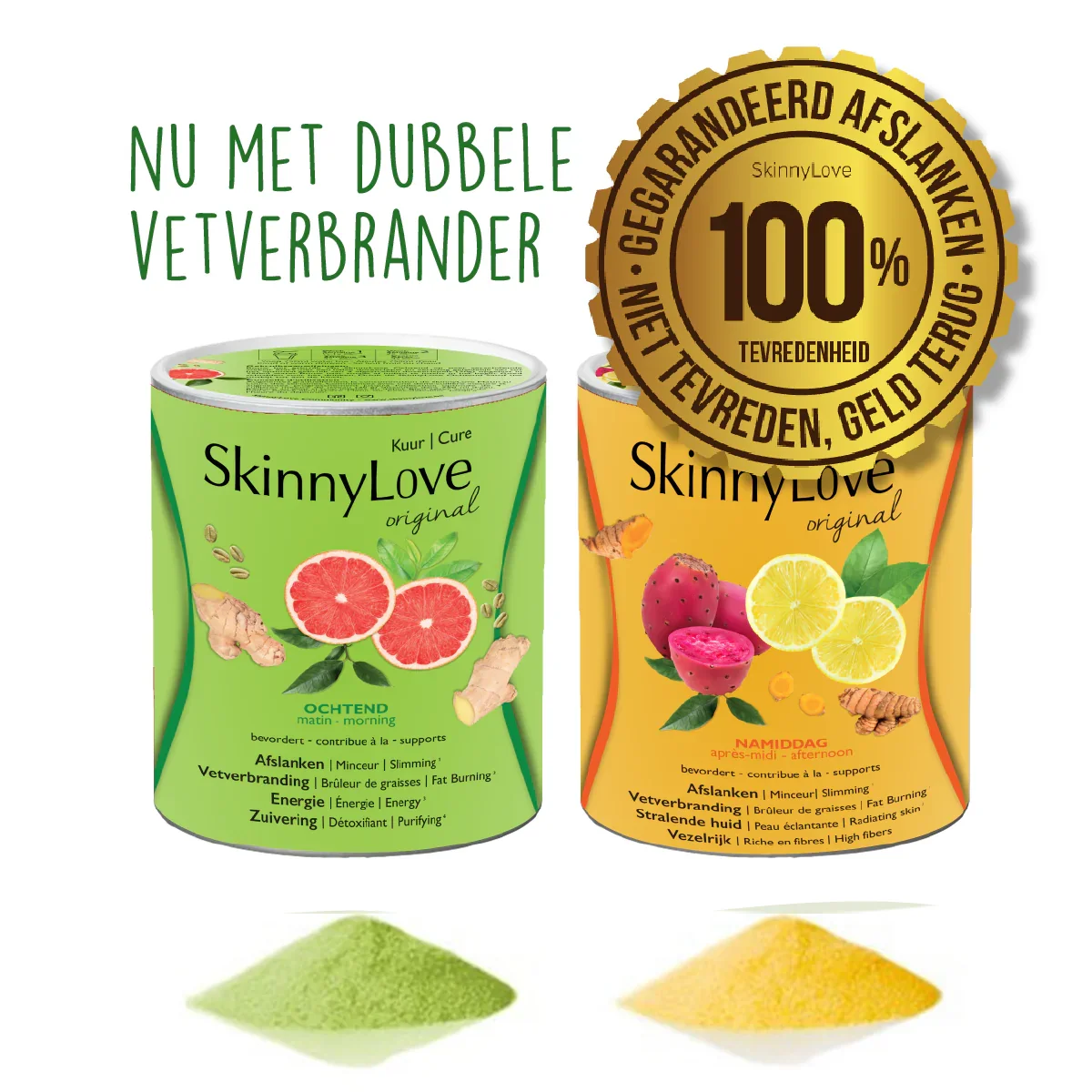 SkinnyLove is een afslankmiddel met GEGARANDEERDE werking SkinnyLove vermageringskuur (2x 500g) is nu incl. 100% afslankgarantie: niet tevreden, geld terug* Deze SkinnyLove vermageringskuur 1 (nu met dubbele vetverbrander ²) werkt afslankend , versterkt je lichaam ⁴ en geeft je meer vitaliteit ⁵ dankzij 100% natuurlijke ingrediënten. De zuiverende werking ⁶ heeft niet alleen effect op je lichaam maar zorgt ook voor een stralende huid ⁷ ! Vergeet alle diëten die je ooit geprobeerd hebt en beoefen maar één sport: schudden en drinken. Je hongergevoel vermindert door de aanwezige vezels¹⁰ en je zin naar zoet neemt af ³ . Jouw nieuwe ik schuilt achter je toekomstige SkinnyLove proof levensstijl. Deze SkinnyLove vermageringskuur is de originele versie die een pittige smaak heeft. Als je voor de eerste keer start met SkinnyLove kan de SkinnyLove Fruity met zijn zachte fruitige smaak een betere optie zijn om op te starten.
