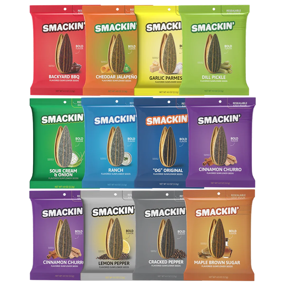 Try all of our classic flavors - Lemon Pepper, Maple Brown Sugar, Ranch, Cheddar Jalapeño, Garlic Parmesan, Backyard BBQ, Cracked Pepper, Dill Pickle, Cinnamon Churro, and OG "Original". We’ve reimagined all your favorite sunflower seed flavors with no salty burn and insane seasoning for a seed experience unlike any other! Variety Packs include two (2) resealable 4oz bags of Backyard BBQ and Cinnamon Churro & one (1) bag of each Original, Cracked Pepper, Garlic Parmesan, Dill Pickle, Lemon Pepper, Maple Brown Sugar, Cheddar Jalapeno, Ranch - 12 total bags.
