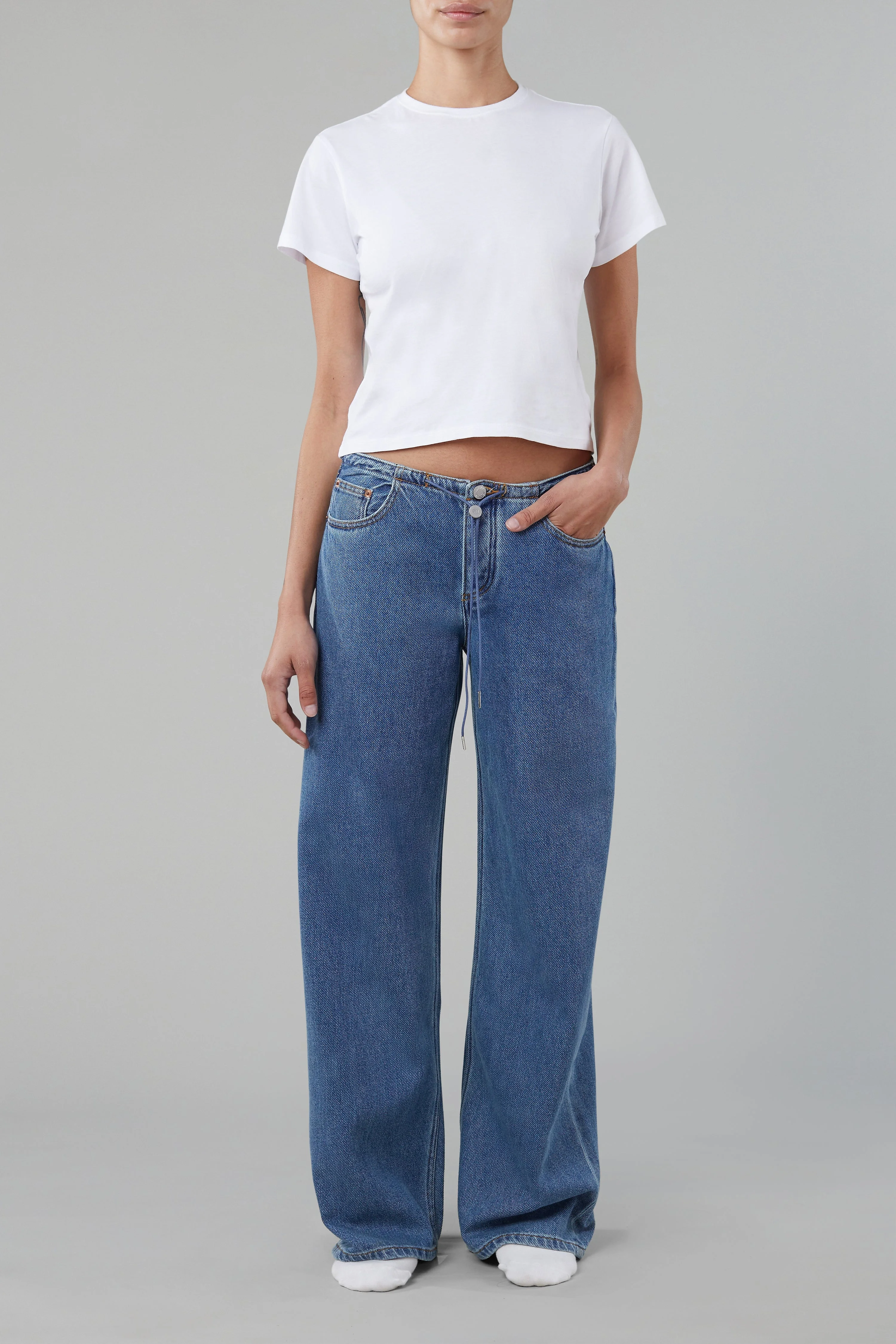 The Sport Jean is a low-rise, relaxed-leg jean with drawstring toggles at both hems, allowing for both a cinched jeanie leg or straight leg wear. Featuring a waistband-free construction and a discreet zipper closure for an uninterrupted silhouette. The Sport Jean in Pear is crafted from our Cloud fabric—our softest denim yet. Made from 100% cotton using advanced weaving technology, it drapes effortlessly on the body and offers breathable comfort from day to night. 100% Cotton