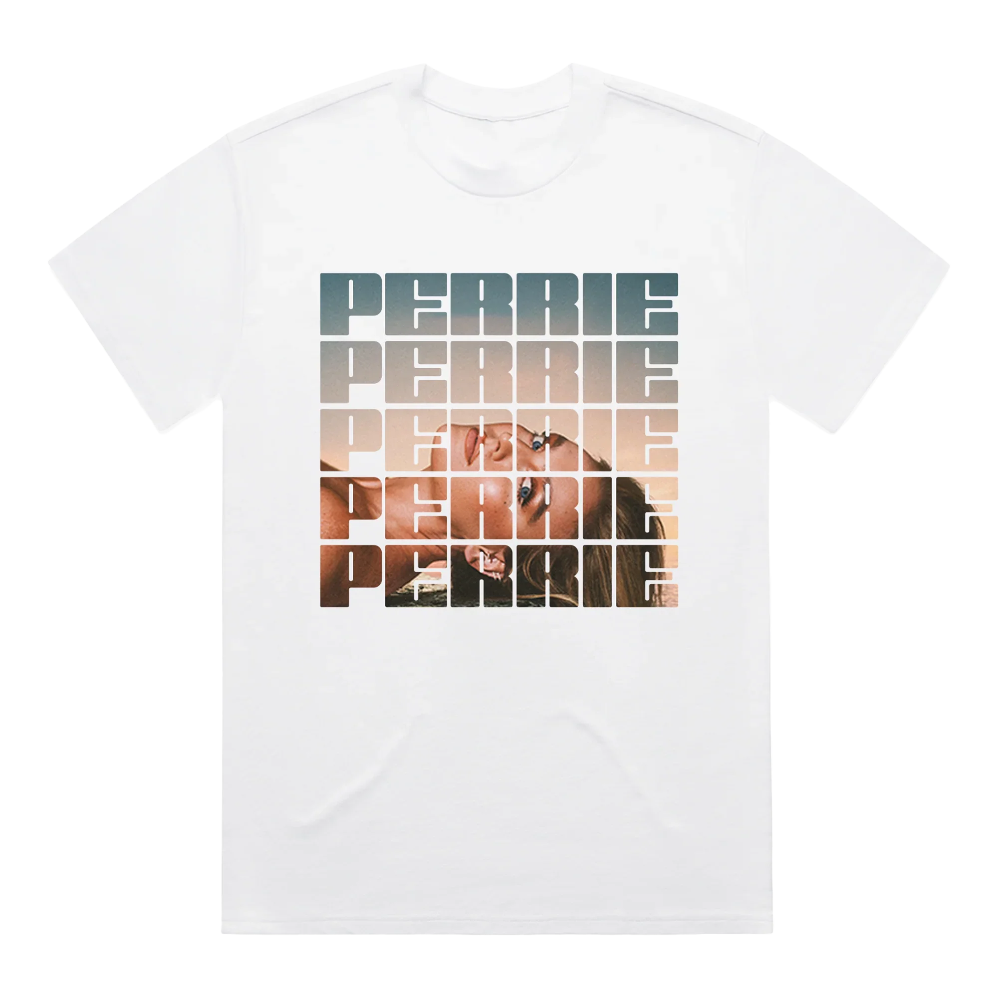 White, short-sleeve T-shirt with Perrie album artwork design across the front. 100% Cotton Regular Fit Unisex