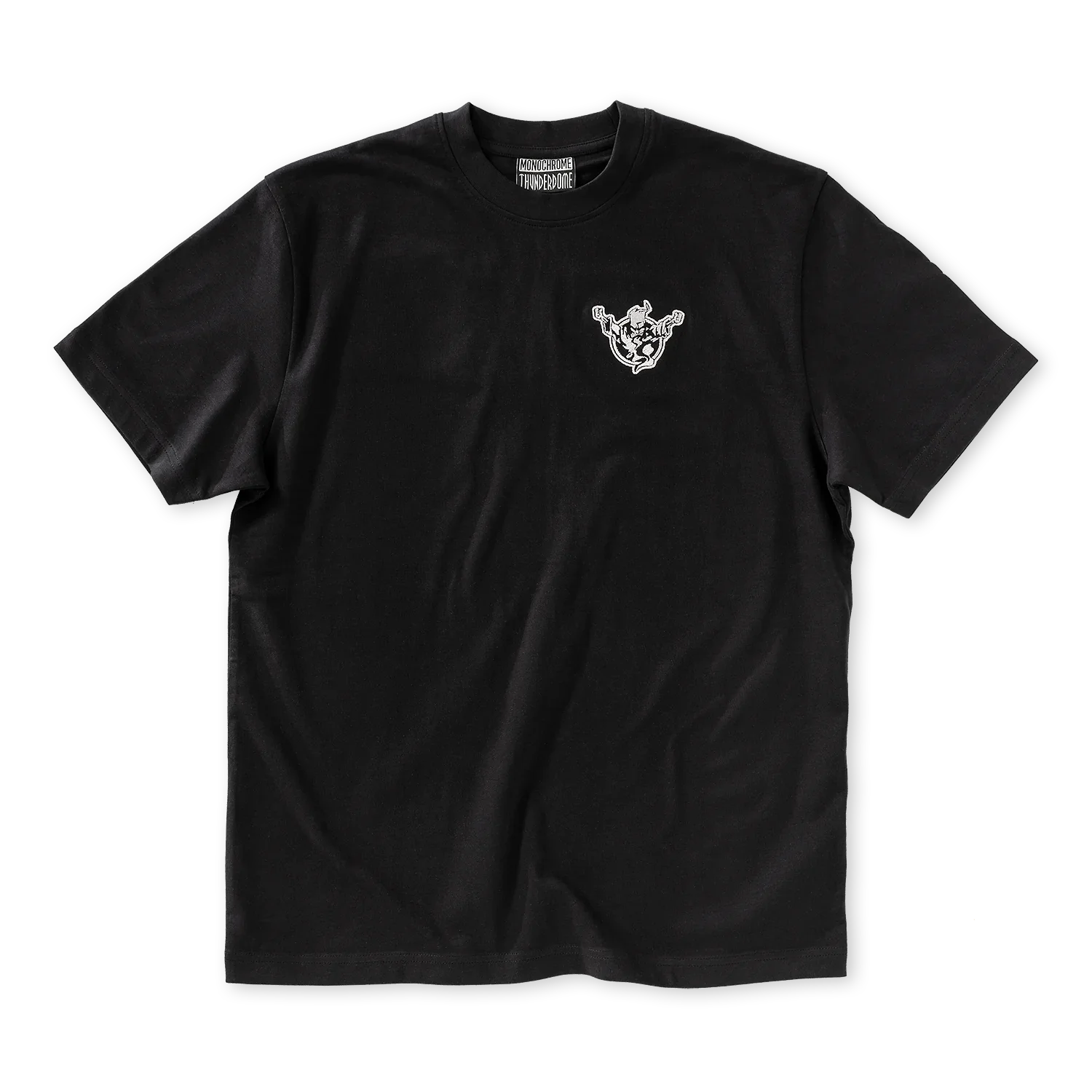 Embroidery of the Thunderdome Wizard on the back, including an embroidered Thunderdome logo on the front. This hoodie has a boxy fit.