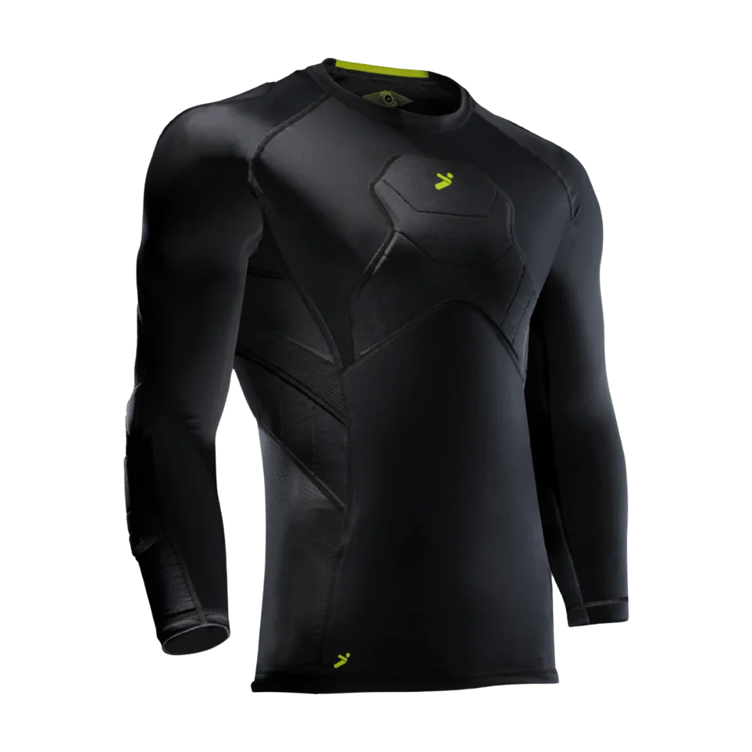 The BodyShield GK ¾ Undershirt delivers pro-grade protection in a base layer built for impact. With Poron XRD® padding at the chest, ribs, shoulders, and elbows, it absorbs up to 90% of impact force while staying low-profile and flexible under pressure. BodyLock™ compression fabric wraps tight to keep every pad locked in place, while EdgeGuard™ overlays reinforce high-friction zones to guard against turf burn and abrasion. AirFlex™ mesh panels under the arms keep airflow moving through high-intensity play, and the ¾ sleeve cut clears your wrists for a clean glove fit. From warm-up to the final whistle—this is protection that plays as hard as you do. Poron XRD® padding at chest, ribs, shoulders, and elbows, absorbs high-impact contact without bulk BodyLock™ compression, delivers a second-skin fit that stays secure through every movement EdgeGuard™ abrasion zones, reinforce high-wear areas for turf-tested durability AirFlex™ mesh panels, ventilate underarms and release heat during intense play ¾ sleeve cut, eliminates wrist bulk and layers clean with gloves For serious goalkeepers who throw themselves into chaos and want protection that stays tight, plays fast, and never holds them back.