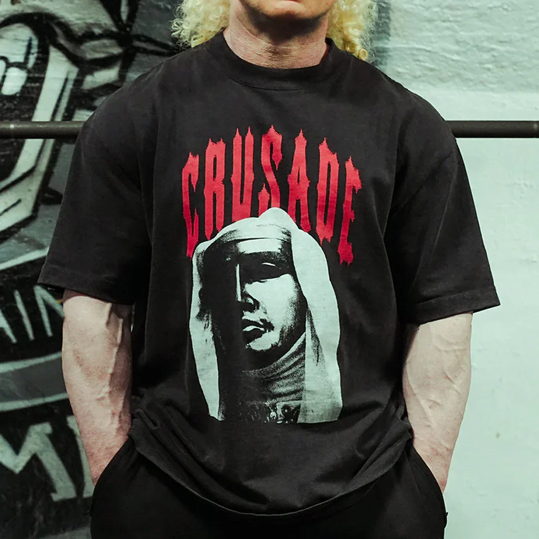 DEUS VULT - God wills it. - Premium 250gsm 100% Cotton fabric - Oversized Cut with Drop Shoulders - Durable and Based Christian Gymwear Due to the nature of the large print, slight ink smudges are present at the sleeve seams. This raw, authentic look is a mark of Sunday Mass craftsmanship.