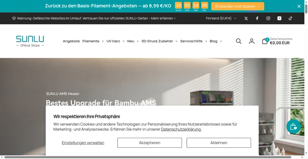 Offizieller SUNLU-Onlineshop, kostenloser Versand. Sie können SUNLU 3D-Drucker, 3D-Druckerfilament, PLA+-Filament und 3D-Druckresin für Ihren 3D-Drucker kaufen.