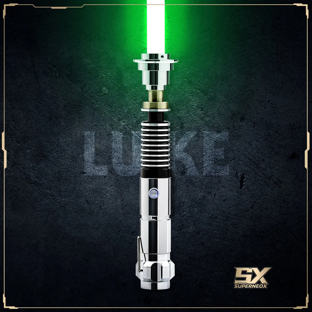 The Luke saber draws inspiration from the classic weapon wielded by a legendary warrior. Its hilt, a testament to artistry and precision, is constructed with the utmost care and attention to detail. Crafted from the finest T6 aircraft aluminum, it radiates strength and resilience, ready to withstand the rigors of intense duels and combat scenarios. The hilt features a striking design, with a sleek stainless silver body that exudes elegance and sophistication. The black, ribbed handle provides a secure and comfortable grip, ensuring that the saber becomes an extension of your own hand. Adorned with a bronze choke point just below the emitter, it adds a touch of regality and distinction to the overall aesthetic. With the Luke saber in your possession, you become a force to be reckoned with. As you engage in intense duels, the clash of lights and the hum of the blade will resonate through every fiber of your being. Technique and instinct meld together, guiding your strikes and parries with an otherworldly grace.