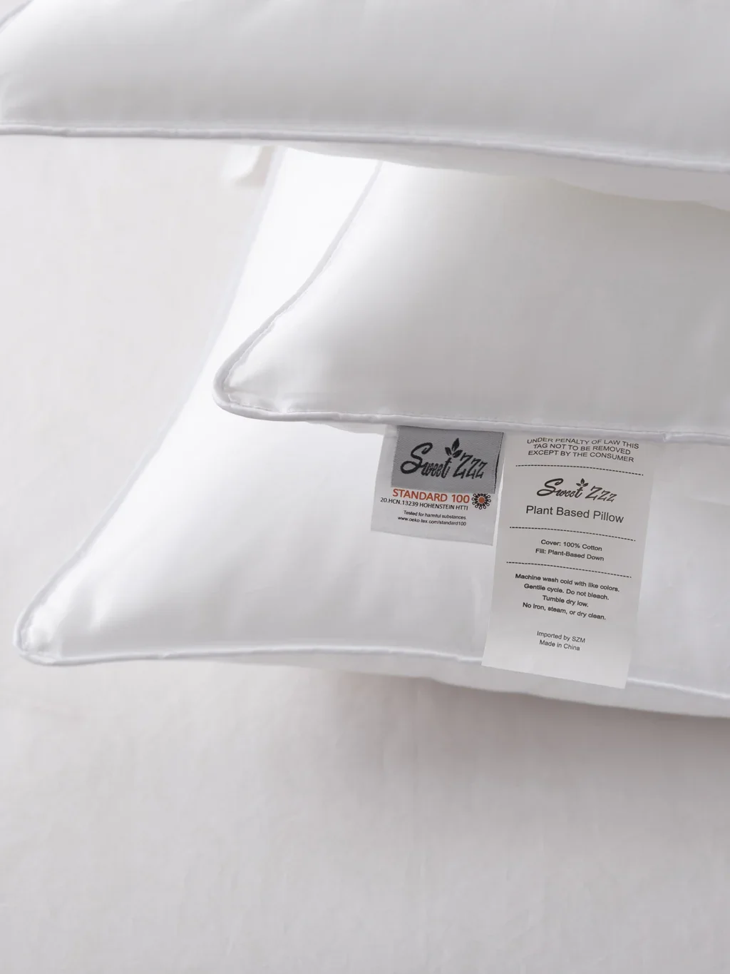 Details FAQ’s Care & Sizes 100% Vegan Plant-Based Down fill. Softer than down with none of the shortcomings. Plusher down in the outer layer for pressure relief and comfort. (Fixes firm pillow issues) Firmer down in the inner layer for contouring and support. (Fixes soft pillow issues) Designed with plenty of air circulation and cooling cover. (Essential for hot sleepers) 100% natural cotton cover to increase overall cooling and skin-friendliness. Sustainable & Certified as safe for babies and those with sensitive skin. OEKO-TEX® Standard 100 CERTIFIED. 20.HCN.13239 50-Day return policy. Enjoy 50 days return policy on all our pillows. + How Did We Make This Pillow Work For Everyone? Simple, we eliminated the 3 issues all pillows have: 1- Lack of support leading to bad spinal alignment (soft pillow issues) 2- Lack of comfort leading to numbness and pressured nerves (firm pillow issues) 3- Lack of cooling leading to overheating and tossing and turning (synthetic pillow issues) + How is the Plant Based Pillow any different than other pillows? Two things make the Sweet Zzz Plant-Based pillow so unique: 1- Our unique natural fill. The fill is as luxurious as feathers without the allergies and animal cruelty while still not synthetic. Our plant-based down is the perfect solution with all the benefits and none of the drawbacks. 2- Our unique comfort/support design. Our pillow uses a less dense fill on the outer layer to feel plush and comfortable and uses a much denser fill on the inside layer for support. This way the pillow is both comfortable and supportive while also being able to work for different people who use different sleep positions. + I have neck pain. Will this pillow help? Can it help with arthritis? Yes. To help with arthritis, a pillow needs to have the correct amount of support and still be soft enough to alleviate pressure points. The Sweet Zzz Plant Based Pillow was designed to be exactly that! Our pillow uses 2 different densities of plant-based down alternative fills to help with firm support and soft comfort. This leaves your neck perfectly aligned while alleviating your neck’s pressure points at the same time. + Will this pillow trigger my allergies? No. Our pillow is specifically made with plant-based ingredients for both cover and fill to ensure we avoid feather and polyester allergies and issues. It is also certified to be safe for babies and toddlers. Being made of plants also makes it a very sustainable pillow so you can sleep guilt-free :) + Can I wash this pillow? Yes, here are the care instructions: Machine wash cold with like colors. Gentle cycle. Do not bleach. Tumble dry low. No Iron or steam. + What are the pillow dimensions? The Plant-Based pillow is 20"x 26" in standard. The Plant-Based pillow is 20"x 36" in king. Our Plant-based pillow height is 7 inches in the high profile and 5 inches in the low profile + What is the Plant-Based pillow made of? The cover is made of 100% natural cotton. Fill is made of 100% vegan soybean fiber, also known as vegetable cashmere. This is a very green and 100% vegan down alternative that is better than down and down alternative in every possible way. Designed and tested in the USA, Imported. + What are the care instructions? Machine wash cold with like colors. Gentle cycle. Do not bleach. Tumble dry low. No Iron, steam, or dry clean + How does the 1-year warranty work? The 1-year pillow warranty covers any manufacturing defects that the pillow might have. Minor imperfections of the cotton cover are not covered. The All-in-one Pillow 1- Support: 100% Natural Plant Based Down (Firm Density) - Our pillow’s inner layer is firm and offers the support and contouring needed for better spinal alignment. 2- Comfort: 100% Natural Plant Based Down (Plus Density) - Our pillow’s outer layer is soft and offers the pressure relief needed and works as a supplement to the firm inner layer so the pillow will support your neck without pushing on your pressure points. 3- Cooling: 100% Natural Cotton Cover - by using only natural materials like natural cotton cover and plant-based down, air circulates freely through the pillow, and moisture is wicked away. This makes for a cool and comfortable sleeping experience. 1 2 3 Your browser does not support the video tag. Everyone is talking about our brand and loving our inventions! Which Profile Is For Me? High Profile - 7" Great For Side Sleepers Low Profile - 5" Great For Back Sleepers & Stomach Sleepers Perfect For Every Sleeper We designed the Plant-Based pillow to be just right for any type of sleeper. The way it contours to your head and neck is ideal for any sleeping position. A Pillow Without Any Drawbacks You don’t have to sacrifice price or quality when you get our comfy pillow because despite being made from the finest natural materials and backed by the best service, The Plant-Based Pillow comes with a very affordable price tag. This is the very definition of affordable luxury. Complete Peace of Mind 1-YEAR WARRANTY Our pillows are built to Last So we cover them with confidence 0% APR FINANCING Pay overtime with Shop Pay financing FREE SHIPPING We offer free shipping on our pillow Together, We Can Make Our Planet Greener We are proud to be a member of 1% for the Planet, an organization dedicated to giving back to environmental causes.1% of every purchase will go toward a greener future.