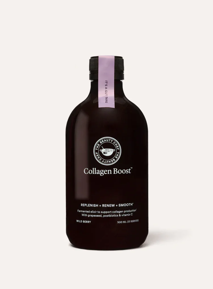 Strengthen. Renew. Smooth. Who: Anyone concerned about skin texture, firmness and fine lines and desires naturally plump skin from the inside out. Strengthen your skin from within and help boost your skin’s natural collagen production with The Beauty Chef’s Collagen Boost™. This beauty-boosting, bio-fermented probiotic elixir has been scientifically formulated to help increase collagen production, support healthy skin structure and cultivate a smoother complexion from the inside out. Collagen Boost™ contains a super-charged, concentrated blend of Certified Organic maqui berry, acai, papaya, blueberry, goji berry and pomegranate powders with grape seed extract, zinc and vitamin C. The potency of these skin-loving wholefood ingredients has been enhanced by The Beauty Chef’s exclusive Flora Culture™ fermentation process, making the nutrients more bio-available and better absorbed by your body’s cells. Collagen Boost™ is rich in natural prebiotics and probiotics to balance your digestive tract and enhance your skin’s radiance. The Beauty Chef’s Inner Beauty Boosts are designed to amplify the effects of your daily skin supplement Glow® .