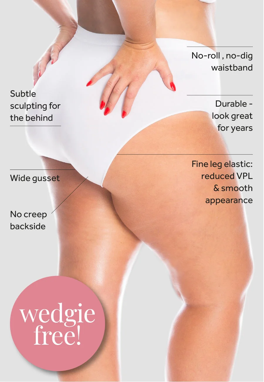 Select PACK SIZE: 3 pack saver (above) to save 20% Ribbed leg-cuff to prevent riding up Sculptured back panels mould to your shape Soft, light and durable seamless fabric (not like tights) Inside leg length is 16cm Our model is also wearing one of our seamless bras