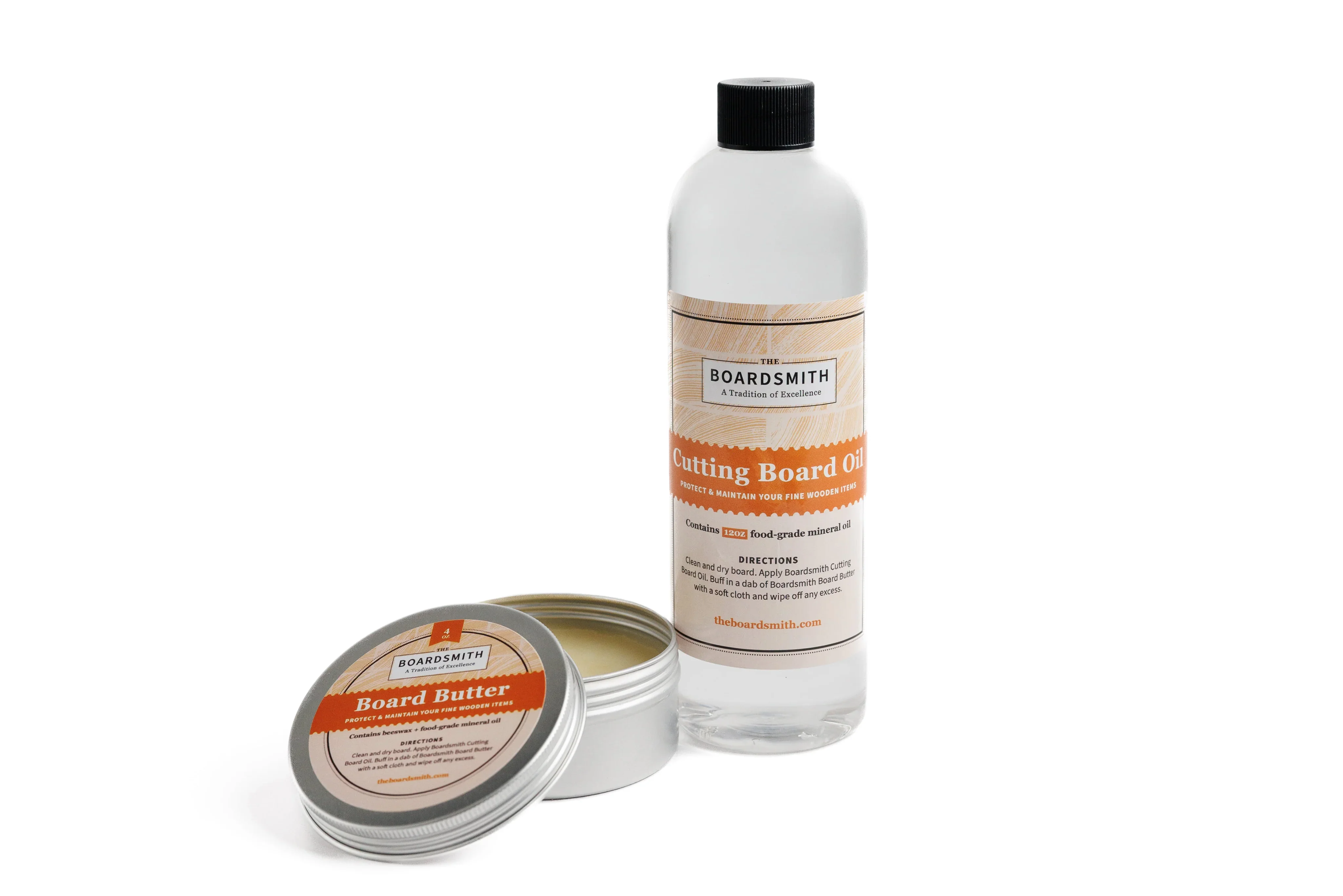 The best way to care for a butcher block is with a combination of Cutting Board Oil and Board Butter. Chopping board oil penetrates deeply into wood fibers, and board butter is a great surface protectant that also gives the board a nice luster. Our cutting board care kits contain the same board butter we've been making for the last 20 years and the same oil that we soak our butcher block in before shipping them to you. Our chopping board oil has a lower viscosity than some on the market, allowing it to penetrate and protect wood fibers better. Our beeswax is sourced from a beekeeper and conservationist in Ohio we've worked with for years. Most beeswax these days is sourced in China, and is often adulterated with large percentages of paraffin and stearin. Ours, on the other hand, is 100% beeswax and sourced exclusively in the U.S. (typically from hives in Ohio, North Dakota, and Idaho). Includes Board Butter (a mixture of Beeswax and USP Food Safe Mineral Oil in a resealable tub) and Cutting Board Oil (USP Food Safe Mineral Oil in a resealable bottle). Available in three sizes: Medium (4 oz Board Butter + 12 oz Cutting Board Oil Large (8 oz Board Butter + 16 oz Cutting Board Oil) XL (8 oz Board Butter + 24 oz Cutting Board Oil) *As a point of reference, an un-oiled 16 X 22 maple butcher block can typically hold 12-14 ounces of cutting board oil. Boardsmith butcher blocks have been oiled prior to shipping, but they still need heavy initial oiling when you receive them. How to use: Thoroughly clean, sanitize, and dry the cutting surface of your board. Pour Cutting Board Oil on face of the board an ounce or two at a time until oil can no longer absorb into the board. This process might take a few minutes. Let dry and wipe away any excess.Using a soft cloth apply a quarter-sized dab of Board Butter and rub inFinish by buffing off any excess butter This product is intended to be an add on item. Due to the weight of the cutting board care kit, we must charge for shipping when it is ordered on its own. To save on shipping, consider ordering with one of our other items to reach the free shipping minimum. Note: Because these are consumable items, care kits can not be returned.
