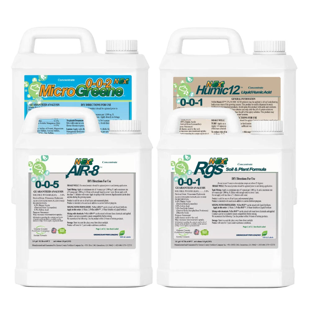 Bio-Stimulant Pack: This pack contains four products that supercharge your lawn growth, improve soil chemistry, and stimulate roots, rhizomes, and/or stolons in your grass. One pack will cover a 5,000 sq ft lawn for 1 year Includes one gallon each of RGS, Humic12, MicroGreene, and Air-8 The Bio-Stim Pack is the "starter pack" of Greene County's N-Ext products In the Bio-Stimulant Pack, you’ll receive 4 gallons in four 1-gallon bottles: 1 gallon N-Ext 0-0-1 RGS 1 gallon N-Ext 0-0-1 Humic-12 1 gallon N-Ext 0-0-2 MicroGreene 1 gallon N-Ext 0-0-5 Air-8 Product Description: Frequently touted as “Lawn Joo-Joo” and “Unicorn Pee” by myself and other members of the Lawn Care Nut community - these N-Ext products are the real deal. Many of our newly minted Lawn Care Nuts ask what bio-stimulants do, and that’s a good question! This combo pack optimizes and unlocks nutrients in the soil so that your turf roots can pull out more naturally existing soil nutrients. At the same time, this will help you create an ecosystem that self-sustains cohesively and needs very little outside input other than the occasional dusting of nutrients. The Bio-Stim Pack is the "starter pack" of N-Ext products designed to get you moving on the right track towards more healthy, optimized soil. 0-0-1 RGS™ Stands for Root Growth Stimulant, and that’s exactly what it does. This biostimulant is packed with hormones from sea kelp that stimulate roots and stolons/rhizomes coupled with chelating humic acid. 0-0-1 Humic12™ is one of the primary bio-stimulants used to improve overall soil health. The 12% concentration in this product is much higher than most currently available to DIYers. 0-0-2 MicroGreene™ is a micronutrient fertilizer with humic and sea kelp. If you have a soil test showing micronutrient deficiencies then this is your go-to product to get your levels moving in the right direction. 0-0-5 Air-8™ Liquid Aeration is designed to create space in the soil, increase water penetration, and encourage deeper rooting to drive more oxygen into the topsoil profile. You can SAVE MONEY with the “mix and match” in our Build-a-Box options . For a list of all Greene County products, here is a link to the other options . Application Information: You will need to water in each of the products in this pack if you apply with a backpack/pump sprayer. If you are using a quart hose-end sprayer, here is a video with instructions. The Bio-Stim Pack products can be applied at any time during the growing season on all grass types, including the following: Cool-Season Lawns - Kentucky Bluegrass, Turf Type Tall Fescue (all fescues), Ryegrass. Warm-Season Lawns - Bermuda, St Augustine, Zoysia, Centipede, Bahia. Custom timing and recommendations are available in our app. Click here to download! Coverage See label details below for specific coverage details Application Details See label details below for specific application details Water-In Instructions Water into the soil within 24 hours with 1/4" of rainfall or irrigation. Label/Specs/SDS: RGS Info , Humic-12 Info , MicroGreene Info , Air-8 Info Download: Bio-Stimulant Guide Package Includes: (4) 1 gallon bottles Storage: Store in a cool dry place away from direct sunlight. The product will store for 2 years under warehouse conditions. Shipping Information: Shipping costs Included for most states within the U.S. NO P.O. Boxes State Restrictions Alaska (AK), Hawaii (HI), and Oregon (OR) Stickers Yes, free stickers with this item Typical Delivery Time 4 - 7 business days Product Type Liquid Concentrate Cancel | Return | Exchange All sales are final, no cancellations, returns, or exchanges