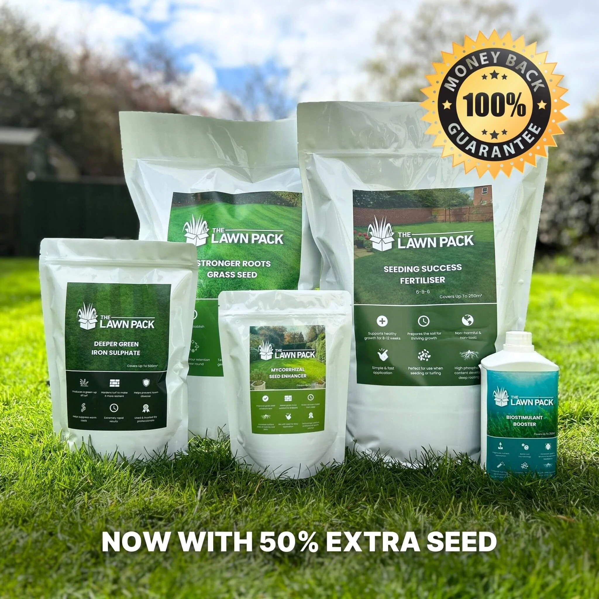 Transform your lawn from patchy and sparse to luscious and vibrant in just 4 weeks. Beginner-friendly guides. Apply in 30 minutes. Get the results usually only achieved by the professionals. Regardless of your previous experience, you will be enjoying your dream lawn in no time or your money back ! One application will: Create lush, green growth in bare patches and across the whole lawn. Result in a hard-wearing lawn able to withstand extreme weather conditions, disease and heavy usage from family and pets. Repair any areas ruined by pets or excess usage. Assist new turf or seed which hasn’t taken well. Help the lawn to out-compete weeds and moss . What's In The Pack? PLUS Easy to follow guides & watering schedule Ongoing support via email or social media BONUS: Free E-Book - 5 Critical Steps You Must Know Before You Even Think About Improving Your Lawn BONUS: Seasonal lawn care calendar Read the full description of contents here . How Does It Compare To Other Options? Average costs: Professional renovation with new turf: £14-18 / SQM. Professional renovation with seed: £10 / SQM. Returfing yourself: £6-9 / SQM. Renovating with The Lawn Pack: as little as 56p / SQM. Why The Lawn Pack? Additional Information The products are safe for children and pets once applied but we recommend to keep products and packaging away from children and pets prior to application. Follow all safety information on all product labels. Please wear gloves when handling products and keep away from eyes and mouth. Safety Data Sheets are available upon request.