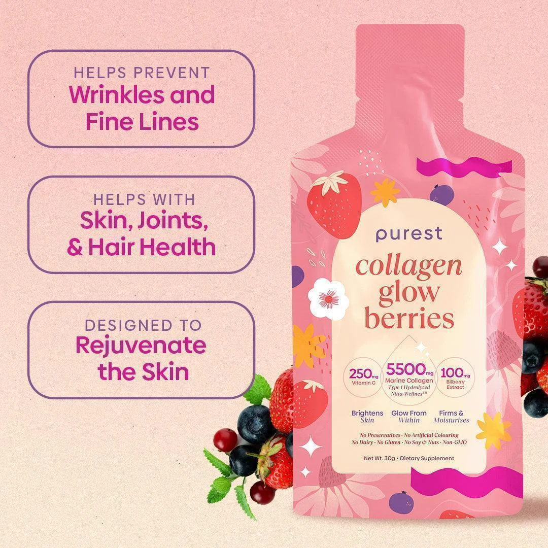 30 Sachets - 1 Month Supply 5500mg of Types I and III Replenwell® Marine Collagen Di-Peptides per serving, which is clinically proven to firm, lift and moisturize skin - and sustainably harvested from Tilapia fish Infused with 250mg Vitamin C & 100mg Bilberry extract Prepared in FDA-registered facility in Taiwan Lightly sweetened with real fruit juice Risk-free money-back guarantee Sustainably harvested from Tilapia fishes Our Collagen Glow Berries are designed to rejuvenate the skin from within , through skin barrier reparation , skin moisturizing and firming . Each serving contains 5,500 mg of Types I and III Replenwell® Marine Collagen Di-Peptides, sustainably sourced from Tilapia fish cultivated in Southeast Asia’s clearest waters. Developed especially by Japanese scientists to rejuvenate, plump, and hydrate skin from within , it’s further hydrolyzed via our exclusive patented technology to extract the purest and highest grade of nano collagen peptide. Our exclusive patented technology uses enzymatic hydrolyzation to ensure extraction of the purest and highest grade of nano collagen peptide, which means faster and more effective absorption of collagen into your body. The addition of 250mg of Vitamin C guards against damage from free radicals while increasing bioavailability, rate of absorption, and assimilation. Consumption Directions: Simply rip, sip, and enjoy. No need to add water Shake well before consumption 1 sachet a day Best to consume before bed or before breakfast Recommended serving for children is half the adult’s Store in a cool and dry place Full Ingredient List: Pure Water, Hydrolyzed Fish Collagen Peptides (PO.OG), Fructose, Apple Concentrate Juice, Gum Arabic, Mixed Berries Concentrate Juice, Black Cherry Concentrate Juice, Vitamin C, Flavouring, Citric Acid, Malic Acid, Bilberry Yeast Extract (25% anthocyanins), Torula Yeast Extract (18% Glutathione), Indigestible Maltodextrin, Xanthan Gum, Sodium Citrate, Sucralose Empirical Research: Collagen is a key component in healthy skin. The patented collagen used in Collagen Glow Berries has been clinically tested and proven to improve skin structure which leads to smoother skin texture and a higher level of moisture. A clinical study investigating the effects of ingesting hydrolyzed patented collagen on the skin was conducted in Japan in 2015. 56 women between the ages of 35-50 participated, half of which took 2,500 mg of hydrolyzed patented collagen every day for 8 weeks and the other half taking 5,000 mg of a placebo. By the end of the study, the group taking the hydrolyzed patented collagen demonstrated significantly higher levels of skin hydration and elasticity compared to the placebo group. You can read more about the study here . 5500mg Replenwell® Marine Collagen Di-Peptides 30g Sachet Size 250mg Vitamin C 100mg Bilberry 30 Calories