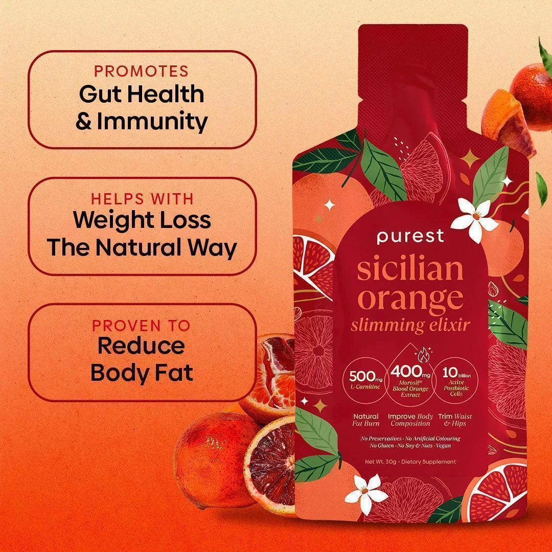 30 Sachets - 1 Month Supply 400mg of Morosil® Blood Orange extract Clinically proven to help with weight loss and reduce waist size Contains 10 bn bioactive postbiotic cells and 500mg L-carnitine that helps to reduce body fat content Lightly sweetened with real orange and apple juice Prepared in an FDA-registered facility Risk-free money back guarantee The Sicilian Orange Slimming Elixir is formulated to help you lose weight the natural way . Our product has undergone strict testing through a government-accredited food analysis company (SGS) and does not contain any chemicals commonly found in clinical medicine . Our key patented ingredient, Morosil® Blood Orange extract , is derived from the Moro Blood Orange, which is the most pigmented of blood oranges varieties. Blood Oranges used in our elixir are cultivated in the rich volcanic soil under the shade of Mt. Etna in Sicily, Italy. Its juice contains a high concentration of anthocyanins which acts against fat accumulation. Morosil ® Blood Orange extract has been proven to reduce body weight, improve body fat composition, and reduce waist and hip circumference. Our proprietary formulation uses 400mg of Morosil ® Blood Orange extract, which is the recommended clinical dosage per day for optimal efficacy based on clinical studies. Our elixir also contains 10 billion active postbiotic cells from the CECT8145 strain which has been clinically proven to reduce body fat and visceral fat content , as well as Fibersol ® dietary fibre and prebiotics, which help to promote gut health and healthy digestion , plus L-Carnitine , scientifically proven for its ability to aid in fat reduction and improve exercise performance . Consumption Directions: Simply rip, sip, and enjoy. No need to add water Shake well before consumption 1 sachet a day Store in a cool and dry place Best consumed 30 minutes before a meal We recommend 2 months of daily consumption to see visible results Full Ingredient List: Pure water, Fibersol ® - 2 Indigestible Maltodextrin, orange concentrate juice, apple concentrate juice, gum arabic, L-Carnitine, Morosil ® Blood Orange extract, malic acid, Bifidobacterium Lactis CECT 8145, xanthan gum, flavouring, monk fruit extract, Forslean ® - Coleus forskohlii extract Empirical Research: Morosil® is a blood orange extract that is sourced from Moro orange juice, grown in Sicily. Moro oranges are high in vitamin C, flavonoids, hydroxycinnamic acids, and anthocyanins that contain antioxidant properties. The presence of flavonoids and anthocyanins in Moro orange help break down fat and generates energy . Morosil® Blood orange extract also regulates your appetite and boosts your exercise routine . According to research, Morosil® Blood orange extract has been proven to be effective. Clinical trials have shown its capacity to support weight loss . It provides a much better supply of fat-burning compounds than comparable weight management supplements. A clinical study was conducted on 60 healthy adults (aged 21-50 years old). All subjects were randomized to Moro group (30) and Placebo group (30). Each subject in the Moro group was given a dosage of 400mg of Morosil® per day for 12 weeks. The results show that after 12 weeks of ingestion, there was a significant decrease in the Moro group's weight, BMI, waist circumference, and hip circumference. More information here . 400mg Morosil® Blood orange extract 30g Sachet Size 10 billion Active postbiotic CECT8145 cells 500mg L-Carnitine 30 Calories