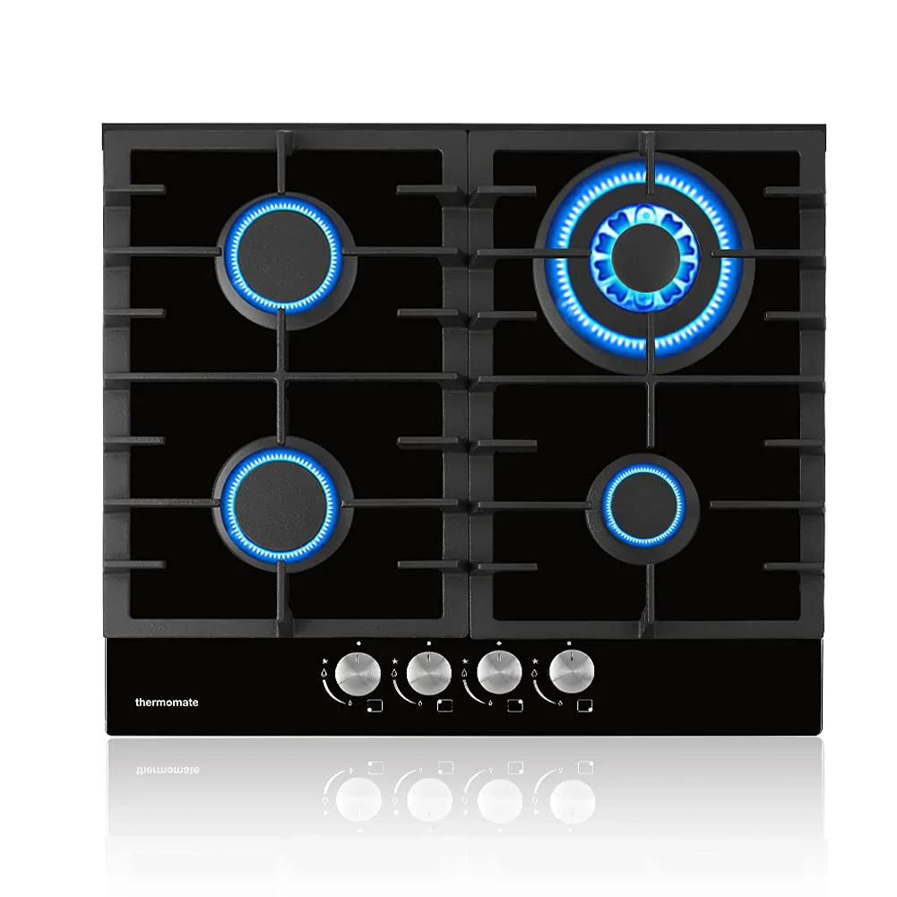 【NG/LPG CONVERTIBLE】 The gas stove delivers the maximum 8.0KW power to propane and natural gas (Default Natural gas). Easily change for LPG use: 1. Replace the natural gas nozzle with an LPG nozzle, 2. Replace the natural gas elbow connector with an LPG elbow connector. Capable for light cooking family, small kitchen, etc. 【4 HIGH POWER BURNERS】 The gas hob equips with 4 high burners: 1x 3.4kW triple ring wok burner, 2x 1.8kW rapid burner, 1×1.0kW auxiliary burner. Each burner distribute even heat to meet a variety of cooking demand. Such as simmer, braise, fry, stir-frying, roast, steaming, boil, melting or caramelizing. 【FLAME OUT PROTECTION】 The gas cooktop is equipped with a thermocouple flame out fault system(FFD) ensures the gas is automatically turned off when no flame is detected, in case of gas leakage. What's more,the ignition is controlled by push-type rotary switch which can prevent accidental touch by children. 【TEMPERED GLASS GAS COOKER EASY TO CLEAN】 Black gas cooktop surface is made of 8MM black tempered glass panel, which is stain and heat resistant, easy to clean, smooth and durable. The glass prevents liquid spillage deep into the countertop 【EASY TO INSTALL】 The gas hob use built-in design to make it perfectly embeded into worktop, saving spaces for you. Template is provided for quick installation. Product size(WxDxH): 58 x 50 x 10cm, Cut-out size(WxD): 56x48cm. Includes 1.2m power cable and UK style plug. The hob features heavy cast iron pan supports to keep pans of varying weights stable. PACKING LIST 1 x Thermomate GHBG604 gas cooktop 1 x Set of LPG injectors (29mbar) 1 x Elbow connector with a gasket 1 x Set of installation fixing kits 1 x Cut-out size board 1 x Instruction manual