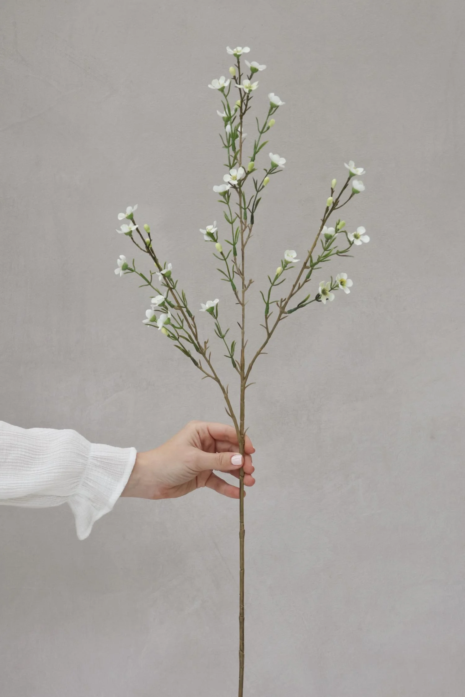 A very pretty and realistic faux stem with a generous scattering of delicate white flowers on a woody brown stem with small and spiky green leaves. I love these styled en masse for a hand picked and gathered look, or simply poke a few stems into your arrangement for movement and texture. All stems can easily be moulded and bent to size, or trimmed with wire cutters. Price is per stem. Dimensions: H: 78 cm