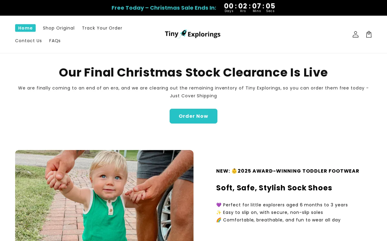 In cart upsell main winter page Hurry up! Just 9 Free Tiny Explorings™ Left ! Check Back in June if Out of Stock Why Is It Free? We are giving away 100 pairs of Tiny Explorings™ to celebrate our 2-years anniversary and to get publicity through word of mouth (Just Cover Shipping). Perfect Comfort & Incredible Convenience With Tiny Explorings Shoe-Socks When getting ready in the morning, just slip them on and enjoy the day knowing that: ✔ Easy to put on and they actually stay on ✔ Footwear specially designed optimal walking for toddlers and babies ✔ Optimized for walking, playing, running, having fun outdoors and indoors ✔ Babies and toddlers feet are kept safe and secure throughout the day ✔ Easy to clean - Just throw them in the washing machine Babies and toddlers all over the world are in love with the Tiny Explorings, because they actually work. "We bought a pair of Tiny Explorings for our daughter and now this is the only kind of shoes she will wear, I'll recommend Tiny Explorings for all parents, they will love it." - Christina N. Enjoy A 90-Day Risk-Free Trial We truly believe in the Tiny Explorings and we belive in them so much, that we provide a 90 - days trial . If the little one aren't completely in love and doesn't wear them everyday, we will refund the full purchase & shipping price - Just contact our 24/7 Customer support. Order Today To Receive Our 90-Day Risk Free Trial Safe & Secure, Everywhere & Anywhere Babies and toddlers can use them to play, walk, run indoors and outdoors, without hurting their feet. Parents can be relaxed knowing their toddler's feet are protected . Toddlers should be able to go and explore with their two own feet, the Tiny Explorings will keep their feet safe on their adventures. (Remember to keep an eye on them) Babies & Toddlers Deserves It All Slipping on the Tiny Explorings Sock-shoes is as easy as putting on your favorite pair of socks and they actually stay on , no matter the situation. They are just as comfortable as normal cotton socks and hard as normal shoes, best of both worlds. Their feet are kept warm and injuri-free , just the way they are supposed to be. Finally a shoe that toddlers actually want to wear. Tiny Explorings Size Chart Not sure what size will fit the little one? Check our size chart here, to ensure you order the right size the first time. Small: Shoe Lenght: 4.5in (11,5cm), Suitable for 6-12 Months Medium: Shoe Length: 4.9in (12,5cm), Suitable For 12-18 Months Large: Shoe Lenght: 5.3in (13,5cm), Suitable for 18-24 Months X-Large: Shoe Lenght: 5.8in (14,8cm), Suitable for 2-5 Years Parents are in love with the Tiny Explorings