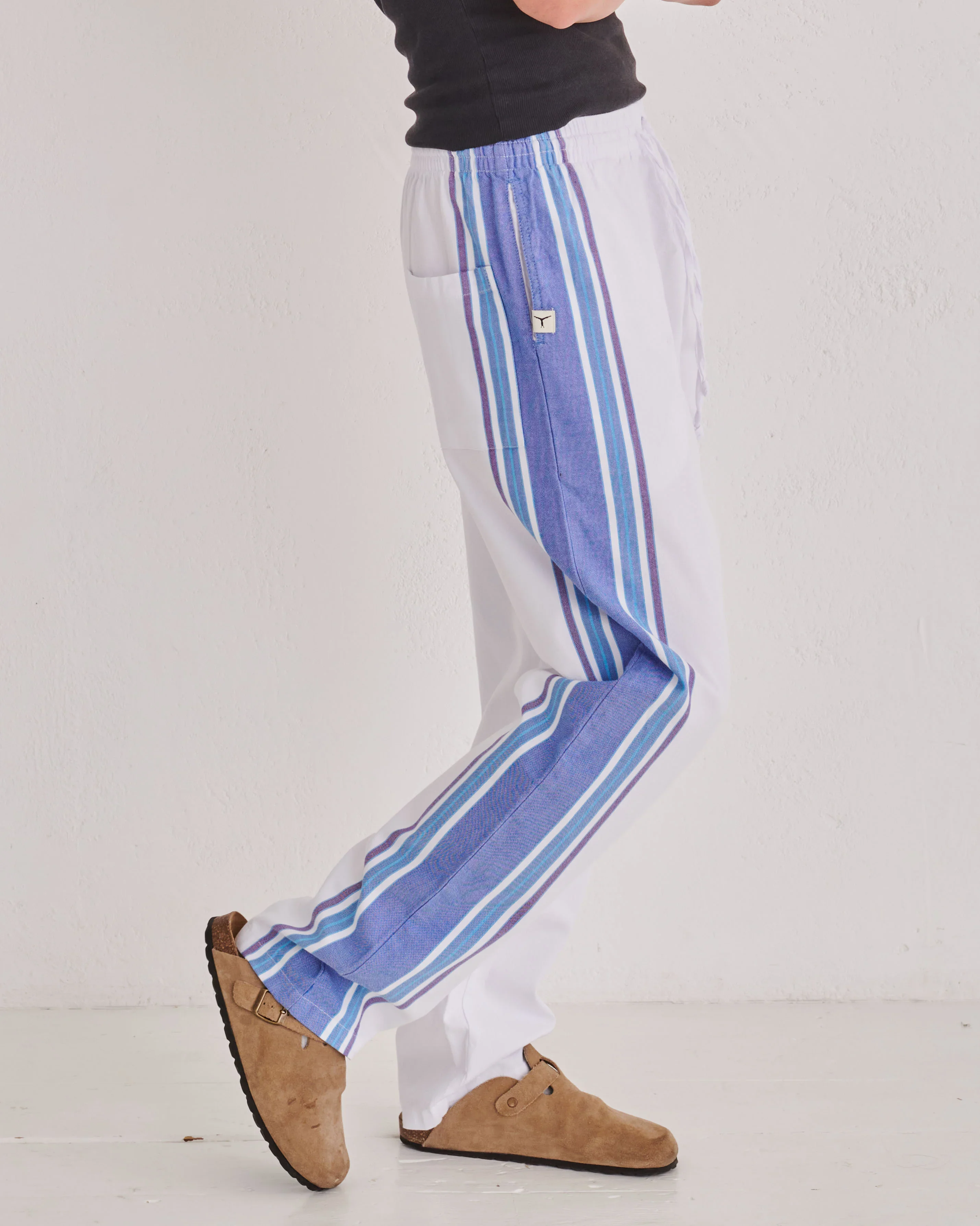 Our Classic Trousers have a relaxed, baggy fit that combines comfort and style, featuring our signature contrast stripe along the side of the leg. Equipped with three practical pockets, an elasticated waistband and a convenient drawstring, they are trousers you'll want to live in. Originally inspired by Kenyan Kikoy fabric.