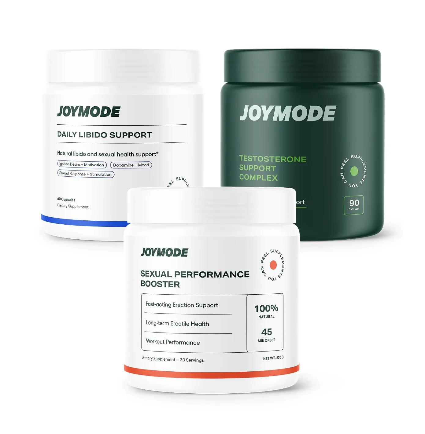 Sexual Performance Booster + Daily Libido Support + Daily Prostate Support + Testosterone Support Complex The complete JOYMODE experience. This bundle is designed to cover every angle of men’s health. Together, they help optimize blood flow, desire, energy, hormone balance, and long-term prostate health—giving you the confidence to perform at your best both in and out of the bedroom.