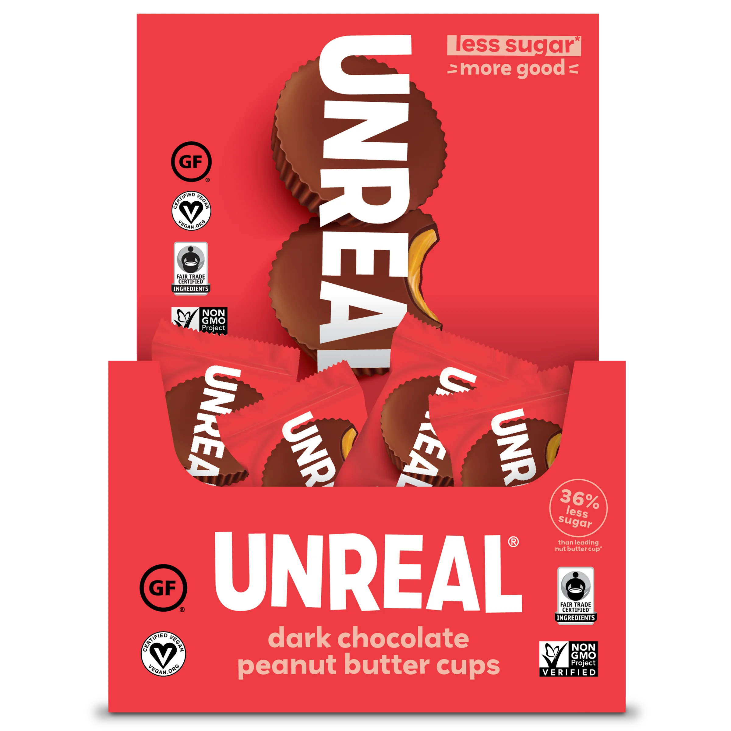 The best chocolate snacks ever. Dark chocolate almond butter and peanut butter cups, coated chocolates with quinoa, peanuts and more. Non-GMO, Fair Trade, vegan, with less sugar and unreal taste. Made good to share good.