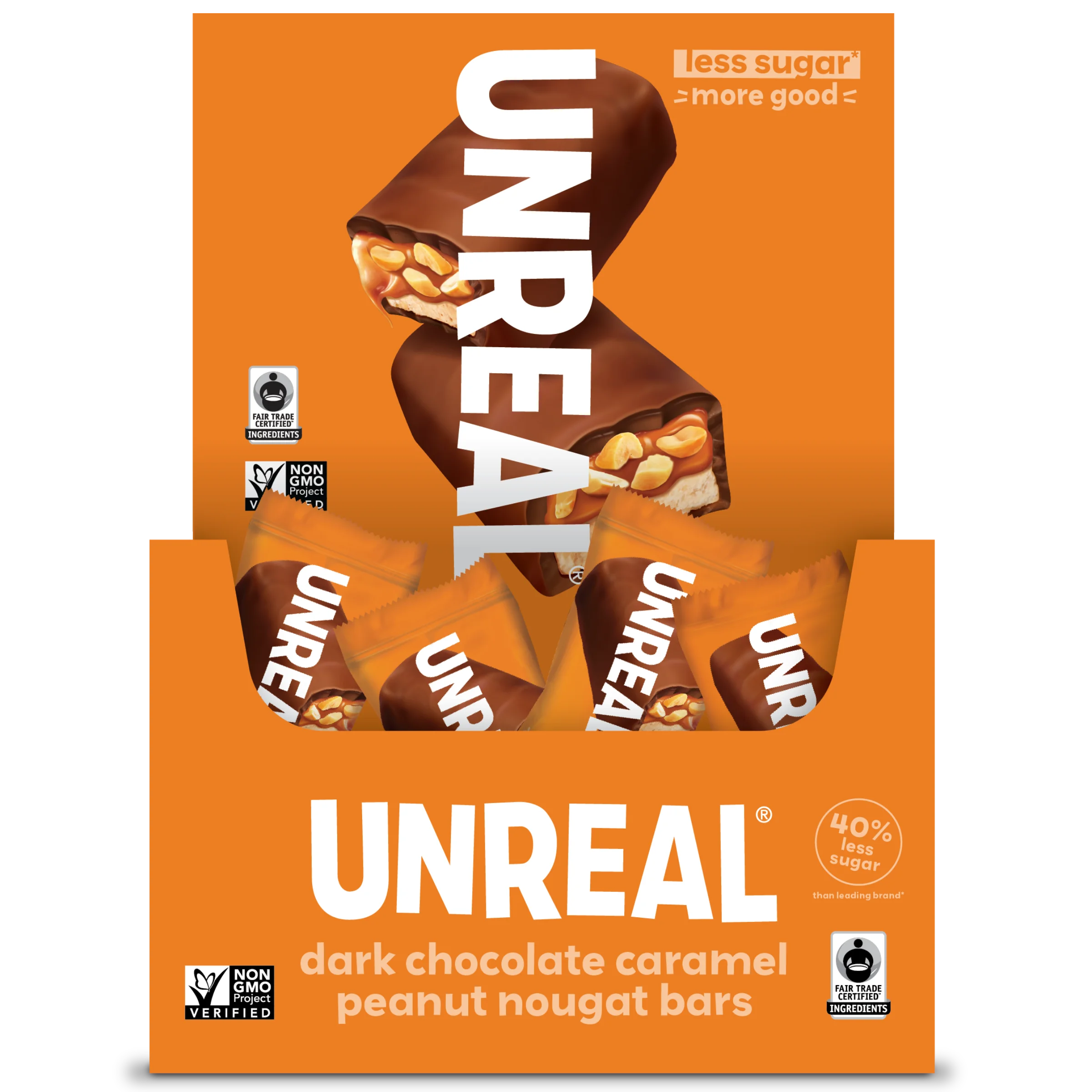 Dark Chocolate Caramel Peanut Nougat Bars. 100% real. Way less sugar. Tastes like nostalgia, but better.