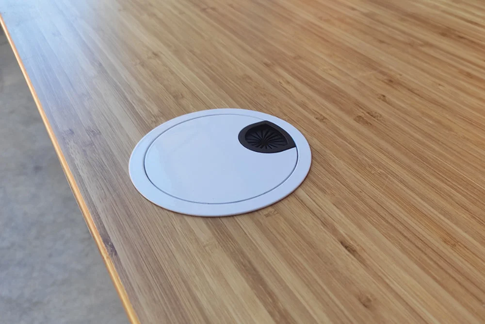These stylish Metal Cable Hole Grommets allow you to maintain a clear, clean workspace by allowing you to route cables through your desk. No more messy or hazardous cables or crawling around under your desk to locate power cables. When you order this product, we drill two holes in your desktop (that is in the same order) as per the pictured diagram. The desk will come with 2 metal cable hole grommets of your colour choice. Grommets accommodate a wide variety of cable sizes. The centre section of the grommet lifts out to allow you easily put cables through (including powerpoint plugs). Available in black and white (colour matched to the PRO Series desk frames). Grommets reduce the chance of cables becoming caught while your desk is raised or lowered. A cable tray (purchased separately) can be installed underneath the desk, directly between the 2 holes allowing for a neat cable management arrangement. The 2 grommets are positioned as per the diagram below. If you find this picture too small go to the gallery pictures for this product and scroll through to the positioning diagram. You can then click on that diagram to get an enlarged picture. Lead time is approx 3 business days for us to install the Metal Cable Hole Grommets into your desktop.