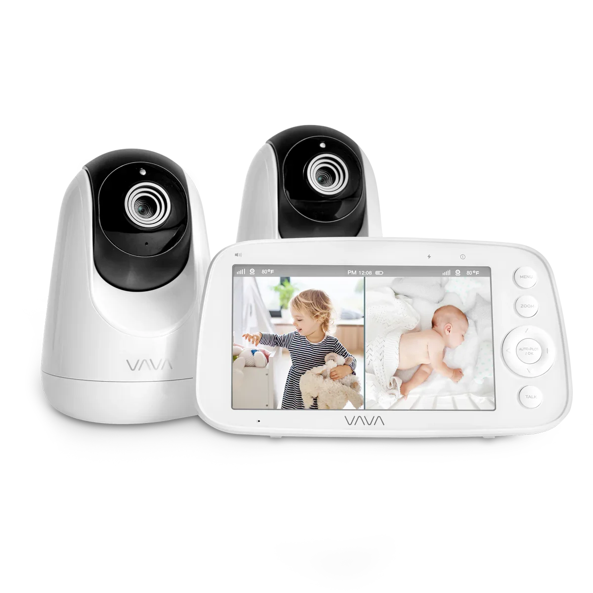A split screen monitor with simultaneous live visuals, the VAVA Baby Monitor with Split Screen is perfect for the growing family. Split Screen: Receive 2 live videos enable you to keep an eye on two rooms or from multiple angles (2 cameras included). Audio & Video Monitoring: 7 volume levels and noise indicator lights for real-time care. All-Day Battery Life: Up to 10 hours with live screen and 18 hours on audio-only mode. Automatic Night Vision Mode: Adjust to lower light levels so you can check on your baby throughout the night. Connect up to 4 Cameras: Receive live video footage from up to 4 cameras. * NOT Compatible with the 8" 1080P Baby Monitor and 1080P Add on Camera.
