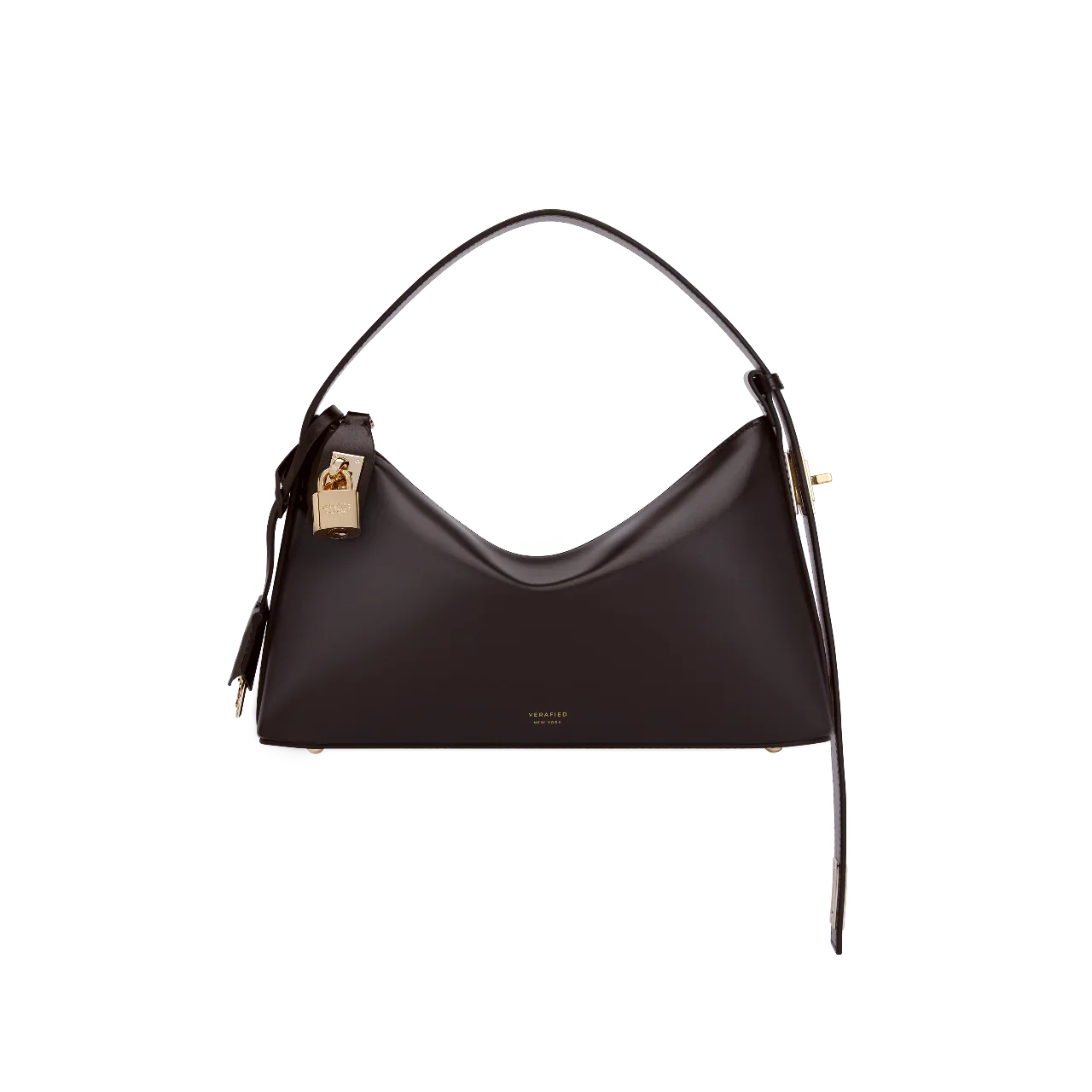 Gold Chocolate Hobo Shoulder Handbag Details For the minimalist dresser, the VERAFIED New York Hobo in rich dark brown is the ultimate staple. Its semi-structured silhouette blends timeless elegance with modern versatility, making it a bag you’ll reach for again and again. The adjustable twister strap with dual clips allows for multiple styling options — wear it on the shoulder, carry it on the arm, or transform it into a sleek clutch. Complete with a functional lock-and-key set , this piece balances style and utility in one refined design. Body: 100% Calf Leather Lining: 100% Cotton Size Length: 26.5 cm (10.43") Height: 16 cm (6.30") Width: 10.3 cm (4.06") Strap Length: Adjustable 37–60 cm (14.6–23.6") Extension Strap Length: 50 cm (19.69") Weight: 1.15 lbs (approx. 522 g) Shipping & Return Free US shipping on orders over USD $100. A standard $12.95 return shipping & restocking fee may apply. For more details click HERE . Free International shipping on orders over USD $300. International orders are considered Final Sale and not eligible for return or exchange.