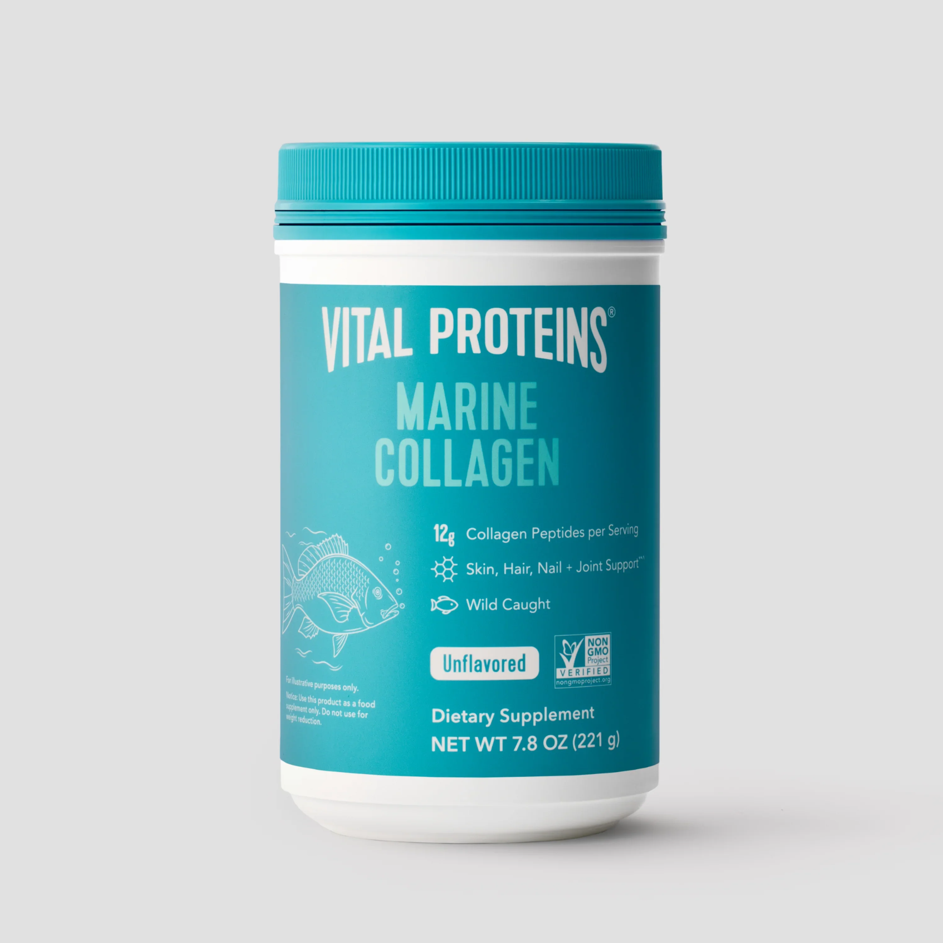 Vital Proteins® Marine Collagen contains 12g of collagen peptides per serving and is made from the scales of non-GMO Certified, wild-caught cod. It's highly bioavailable and digestible.