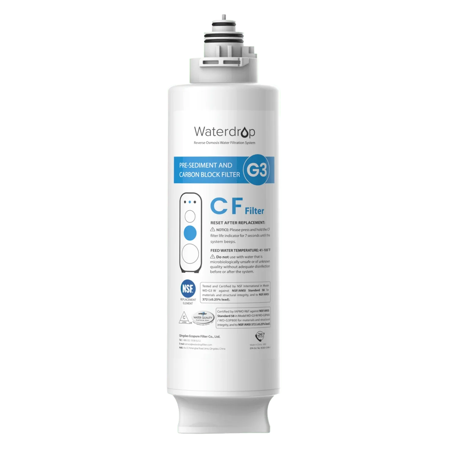 Item model number WD-G3-N1CF Certification NSF 58 & 372 Product dimensions 3.3 x 3.3 x 12.1 inches Material pp cotton carbon block Item weight 1.9 pounds Color White Included components CF filter Why does the filtered water taste funny? 1) The filter is about to expire. Check the indicator reminder to confirm and replace it. 2) The system hasn't been used for a while. Turn on the RO faucet and allow it to flush for a while before drinking. What will happen if I do not change my filter when the filter life indicator light turns red? Over-used filters will degrade the filtration performance, causing contaminants to leak back into the water and adversely affect your health. It's recommended that you replace the filter if the filter life indicator light turns red. Why is the filter life indicator light still red after I changed the filter? You have not reset the filter life indicator. Please reset it: Press and hold the CF filter life indicator for 7 seconds, until the system beeps and the blue light stays on. NSF 58&372 certified Waterdrop reverse osmosis water filter system is tested and certified against NSF/ANSI standard 58, so over 90% of TDS can be reduced after complete flushing. Tested and certified against NSF/ANSI standard 372, Waterdrop RO system employs lead-free materials, giving you a safe product. G3 RO system passed 400+ chemical lab tests, which proves that this system does not contain most chemical substances. System is tested and certified by NSF International against NSF/ANSI Standard 58 for the reduction of TDS, and against NSF/ANSI 372 (≤0.25% lead). Activated coconut carbon block The CF filter employs the activated carbon block made by the superior Sri Lankan coconut shell. In this way, we give you water that is pure and tasty. Service life Provides up to 6 months or 550 gallons of clean water for you and your family, based on water condition. Easy set-up Install the filter in 30 minutes. Replace the filter in 3 seconds. No need to call for a plumber. Your purchase, your love At Waterdrop, we want to use Water4Smile as a platform to promote water stewardship and hopefully trigger wider industry action to make a change. We want first to achieve the vision of “Water for All.” - equal access to clean, safe and healthy drinking water for the whole society. Then raise awareness of sustainable uses of water. To reach this goal, we will continue putting effort and resources into our R&D division, and use innovation to bring fresh water that is socially equitable, environmentally sustainable and economically beneficial.
