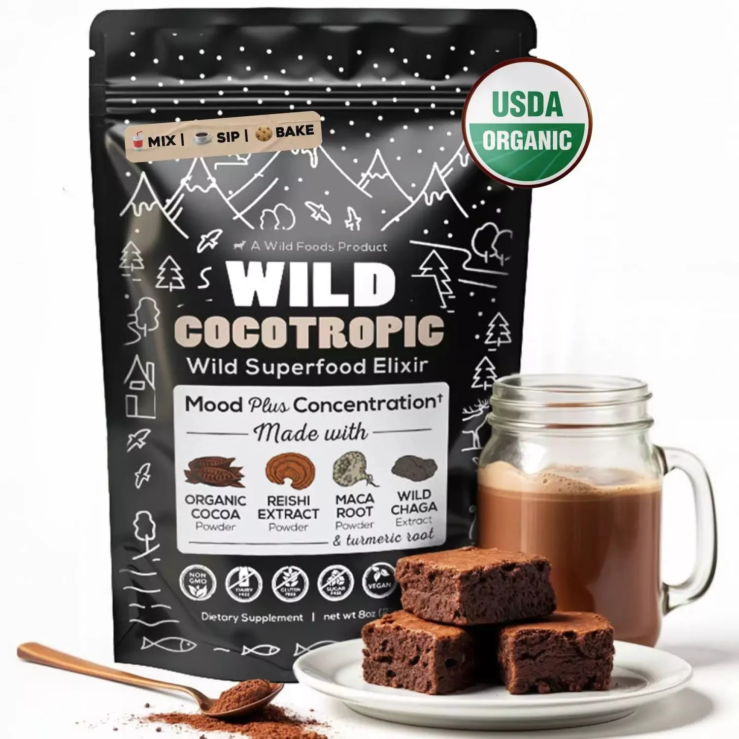 CocoTropic is a mushroom-infused cocoa mix that gives you natural, crash-proof energy, more focus, and a better mood. With 1/8th of the caffeine in coffee, CocoTropic is perfect for replacing your morning coffee routine or boosting it. How do I drink CocoTropic? ☕️ Use hot water or add it to coffee, shakes, smoothies, and recipes. The sky is the limit with this versatile adaptogens blend. Option #1: Make a delicious Cocoa Mushroom coffee with a scoop of CocoTropic. Option #2: Replace coffee with CocoTropic. Just add hot water and your favorite ingredients and mix. What’s in it? This is our favorite part 👉🏻 PURE BEAUTIFUL WHOLE FOOD INGREDIENTS (Per TBSP) : Organic cocoa powder, organic reishi extract (356mg), organic chaga extract (356mg), organic maca powder (356mg), organic turmeric powder (214mg) All ingredients are non-GMO, grain-free, nut-free, soy-free, and organic certified. Our mushrooms are grown by artisan farmers that have been growing mushrooms in high-altitude mountainous regions for generations * There is ~8mg of caffeine per 1 TBSP of CocoTropic