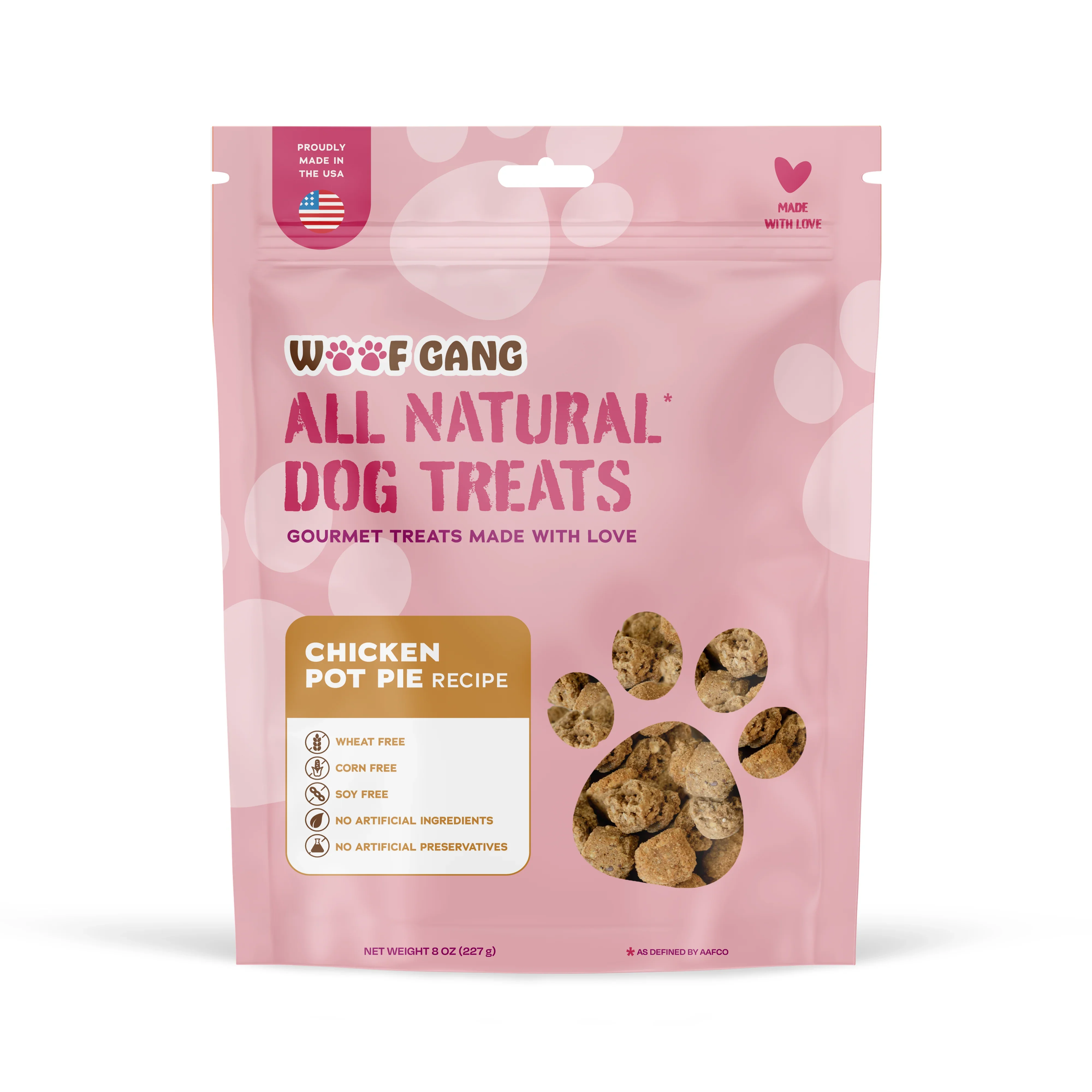 All Natural * Grain Free The Woof Gang Bakery line of all natural dog treats are perfect for your furry friends. These simple, delicious, and all natural treats are made with love and with only the highest quality ingredients. They are proudly made in the USA, and free from wheat, corn, and soy INGREDIENTS Potato Flour Pea Flour Tapioca Flour Peanut Flour Canola Oil Duck Orange Pieces Carrots Peas Parsley
