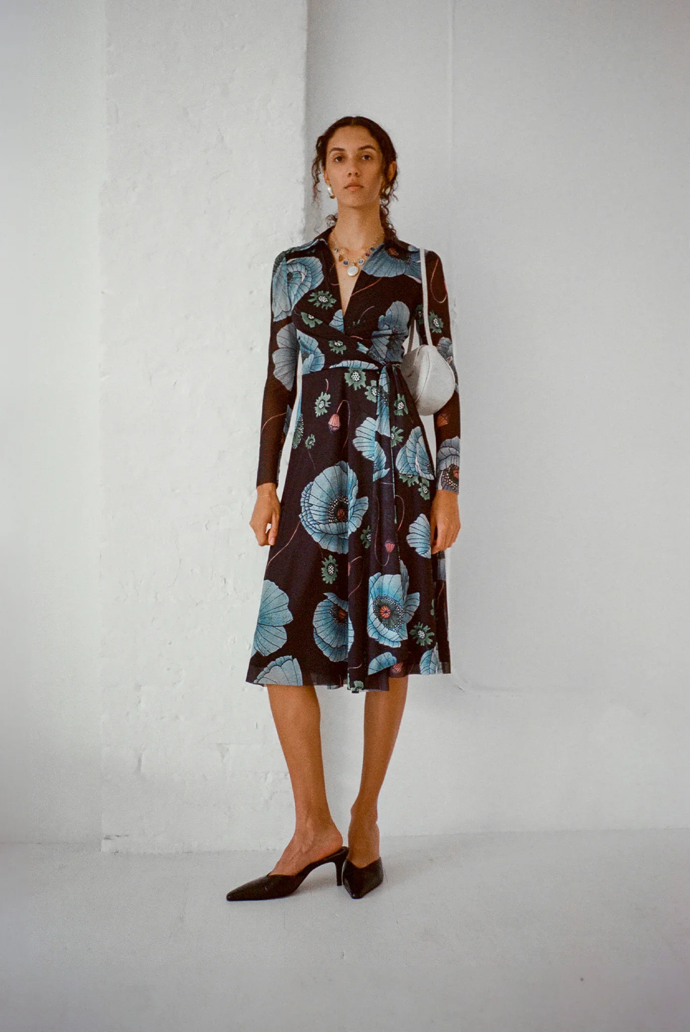 FINAL SALE Items marked as final sale cannot be returned. Final sale items are not eligible for store credit, exchange, refunds, or exceptions. A wrap dress in soft stretchy Night Poppy printed mesh. Features a collar, slim, straight cut sleeves and a tie front closure. The body is fully lined in a second layer of mesh and the sleeves are semi-sheer. This dress has lots of stretch and movement. True to size, but we recommend sizing up if you have a larger bust. Stephanie is wearing a size XL. Stephanie is 5’9" with a 40” bust, 33” waist, and 45” hip. Jolee is wearing a size S. Jolee is 5’9 with a 32” bust, 25” waist, and 35” hip. Vivika is wearing a size 3XL. Vivika is 5’7 with a 50” bust, 43” waist, and 53” hip. 100% Recycled Poly Mesh Hand Wash or Wash on delicate in a laundry bag Do Not Tumble Dry Air Dry Flat Made in a fair trade factory in Hong Kong; Designed and developed in NYC.