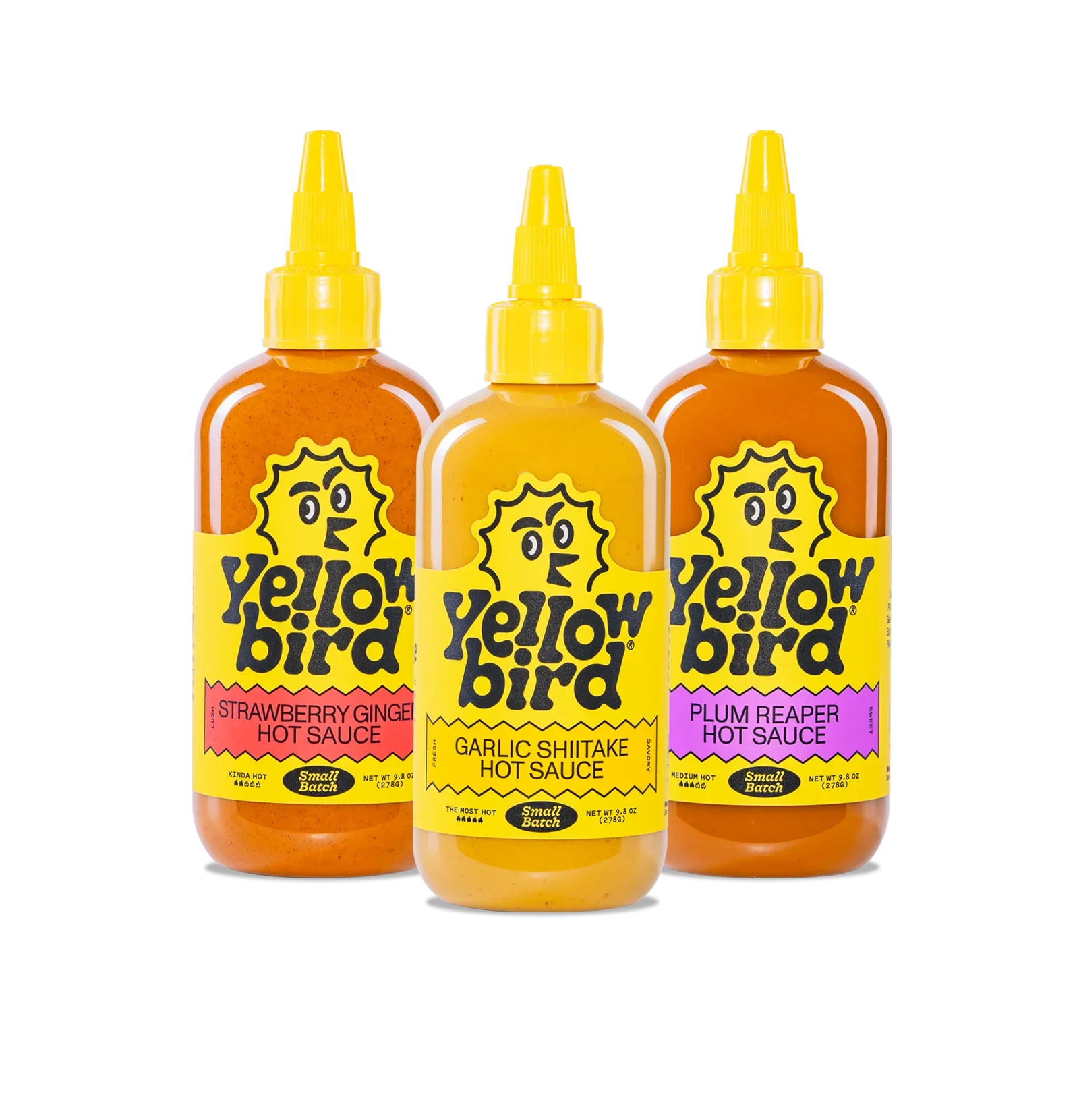 A Variety 3-Pack of our flavor–filled, Small-Batch Hot Sauces made with farm-fresh, seasonal ingredients. Each Small Batch Hot Sauce flavor carries its own unique characteristics and varying heat levels with a rich, smooth, and distinctly Yellowbird texture. Includes 3 bottles—one of each of our Small Batch flavors including Strawberry Ginger, Plum Reaper, and Garlic Shiitake.